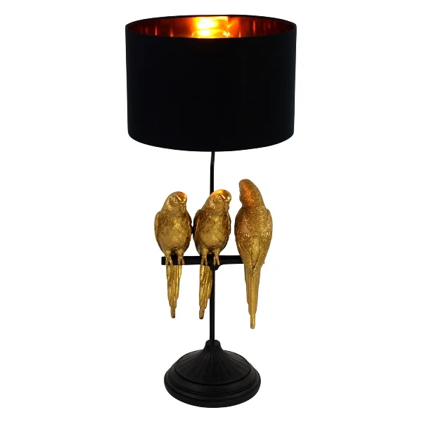 Une touche ludique et réaliste pour cette lampe à poser avec son pied décor perroquet en résine couleur doré, et son abat-jour cylindrique noir et intérieur doré.