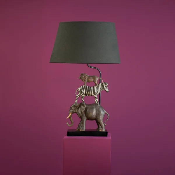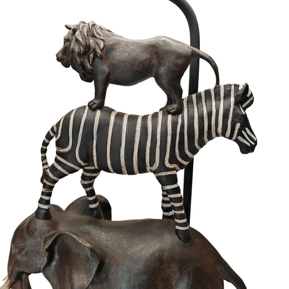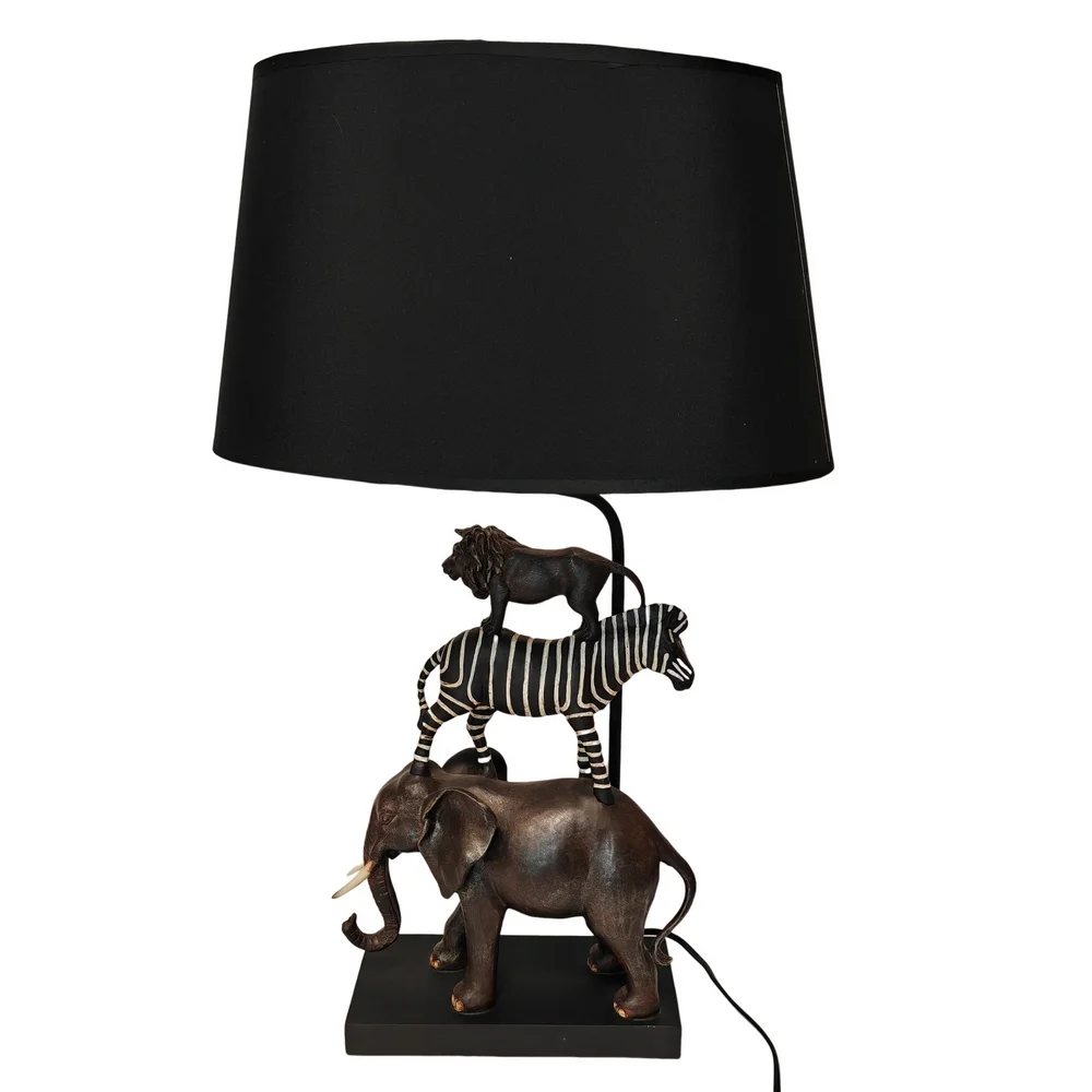 Une touche ludique et réaliste pour cette lampe à poser avec les animaux de la jungle (éléphant zèbre et lion) en résine, Abat-jour en tissu noir .