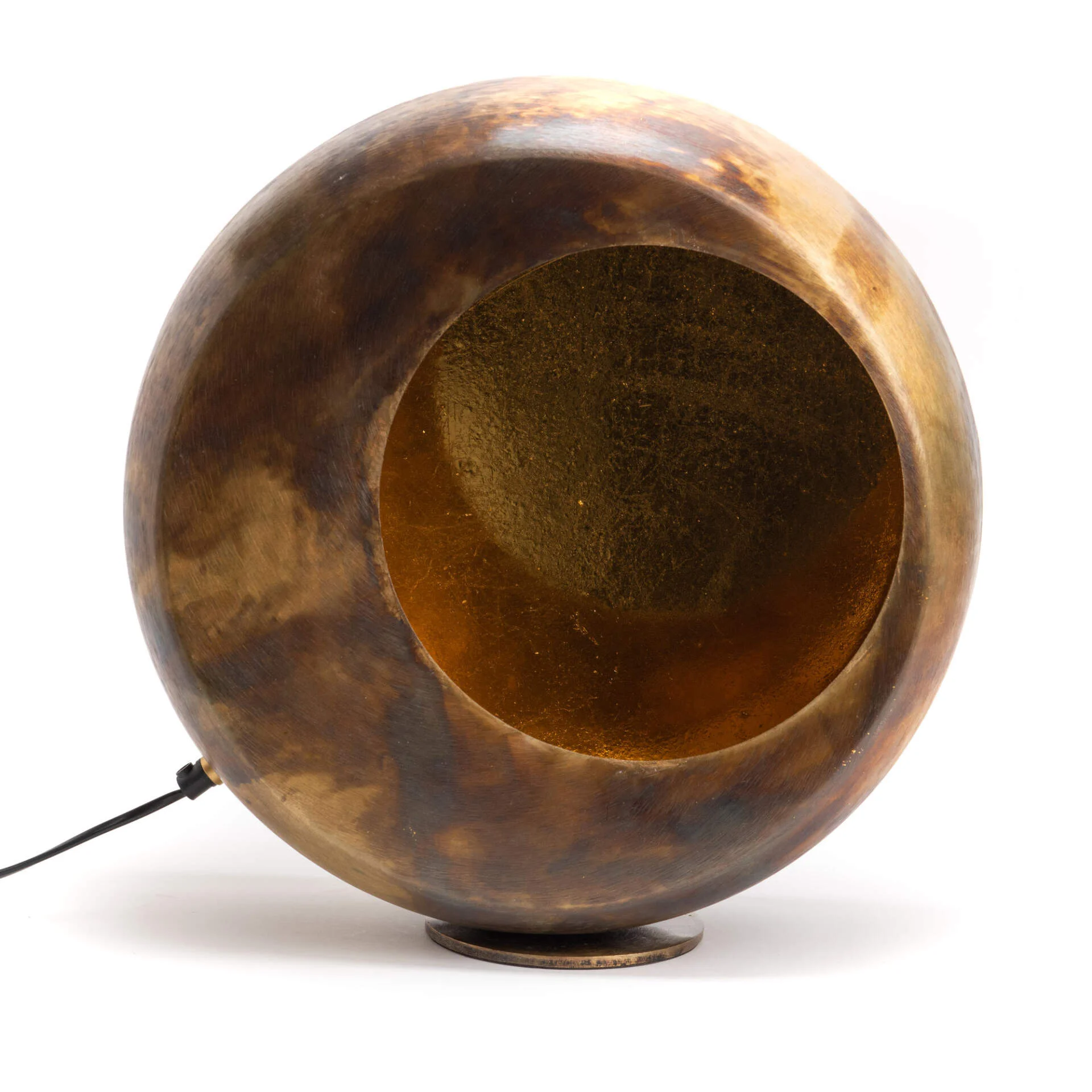 Une touche ludique et réaliste pour cette lampe de table en métal doré patiné en sphère