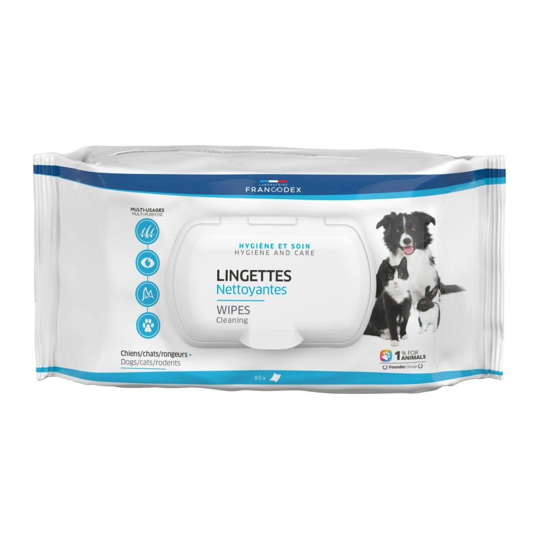 Pour une hygiène impeccable de votre animal de compagnie en tout temps et partout, Francodex propose les Lingettes nettoyantes multi-usages pour chien et chat.