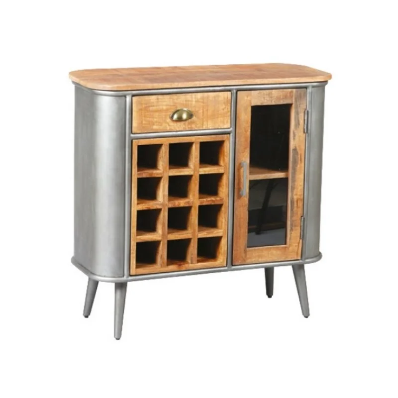 Meuble de style industriel en métal et bois de palissandre aux formes novatrices mélangeant avec succès bois et métal. Le meuble repose sur un ensembles de pieds à l’inclinaison peu commune, comportant en façade une porte vitrée et 1 tiroir 1 bloc range bouteilles amovible. Les éléments bois sont en palissandre massif, l’ensemble des pièces de bois épousent parfaitement cette forme en arrondie.
