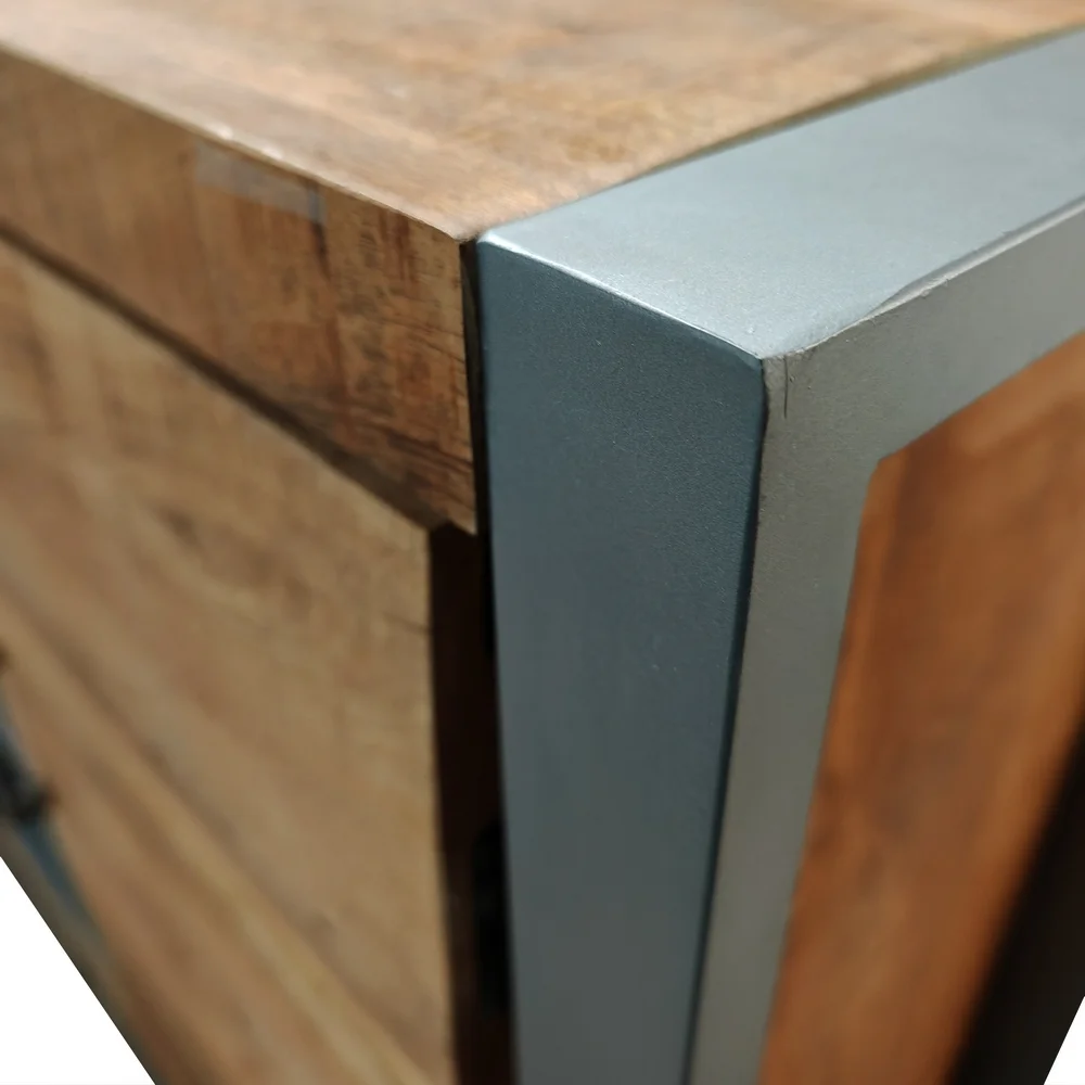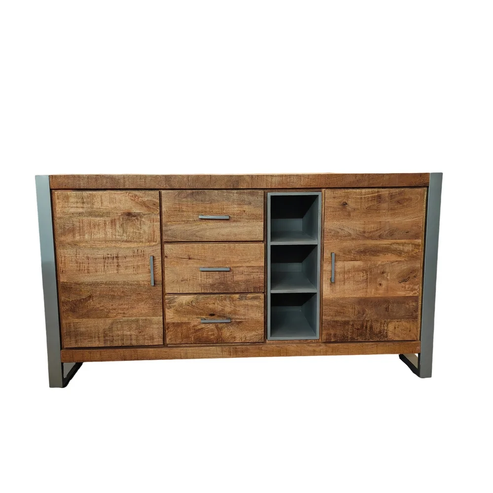 Bahut bas meuble 2 portes 3 tiroirs 3 niches original avec un mélange de bois de palissandre massif et fer pour un style industriel