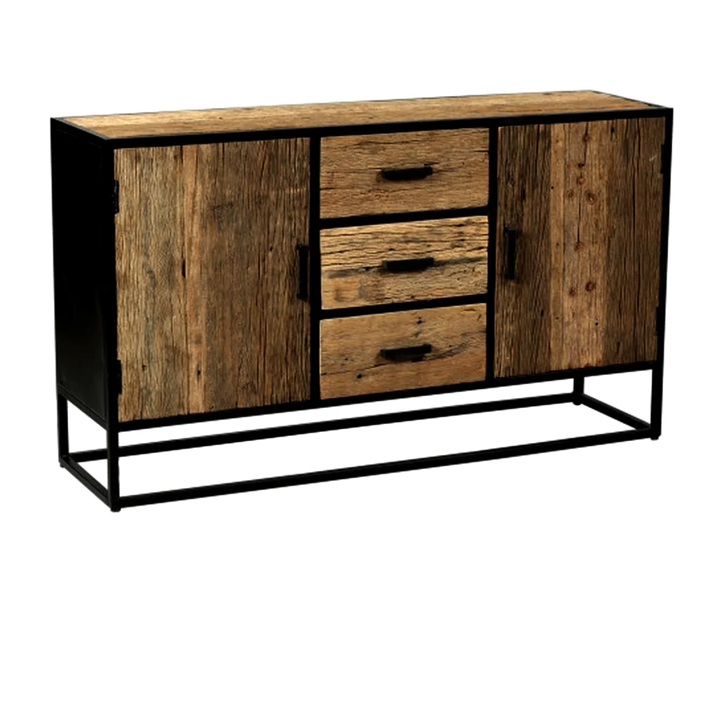 Meuble bahut bas industriel en métal noir et en teck recyclé de démontage de bateau. Ce bahut 2 portes et trois tiroirs est fabriqué avec du bois recyclé qui provient de vieilles charpentes de bateaux ce qui lui donne un style unique car chaque pièce de bois à une usure différentes