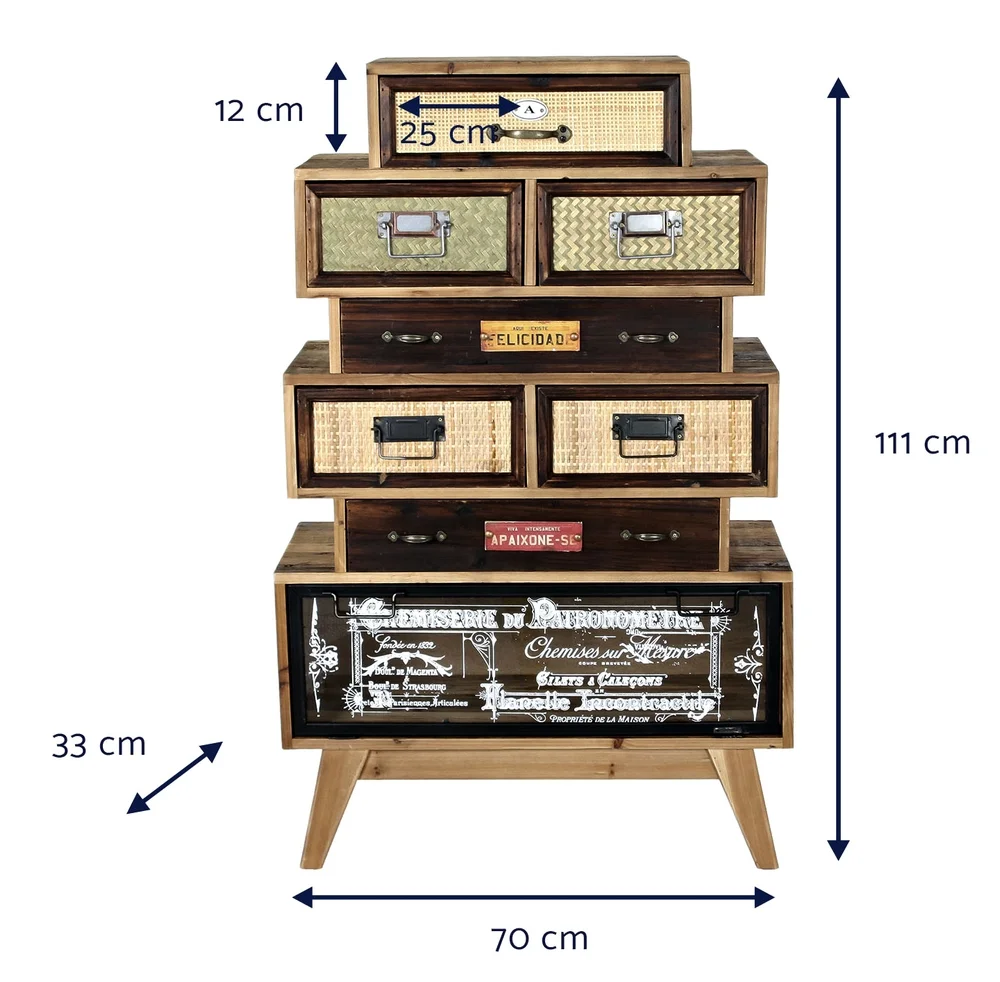 Meuble commode multi-niveaux avec sept tiroirs et une porte basculante structure en bois recyclé vieilli. Optez pour une solution de rangement pratique et peu encombrante en choisissant le meuble commode avec 7 tiroirs et une porte basculante vitrée. D’un coloris bois ciré vieilli il pourra s’accommoder très facilement à tout type de décoration.