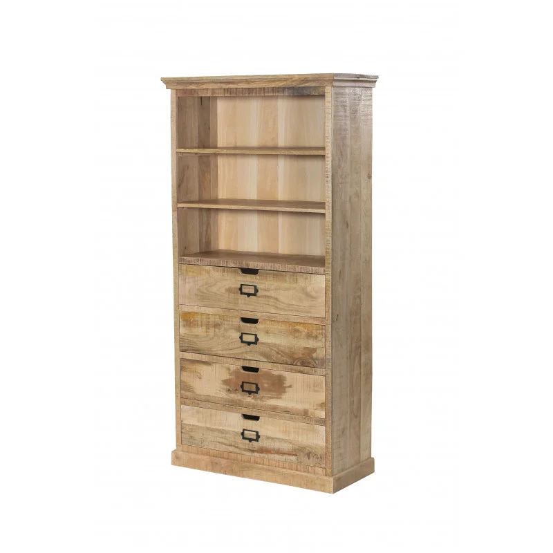 Magnifique meuble haut bibliothèque en manguier massif vernis couleur naturel 4 tiroirs et 3 rayons esprit industriel. Mangora
