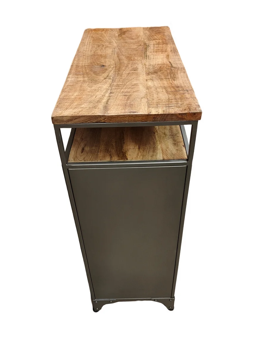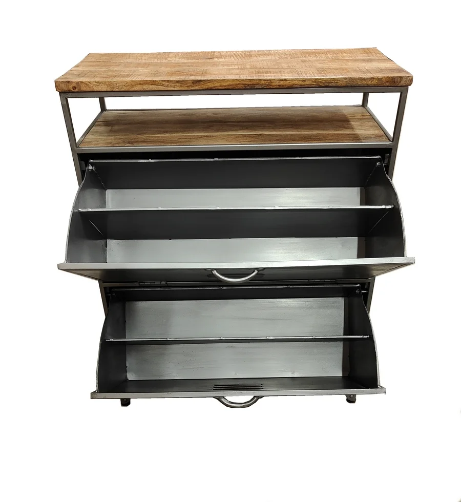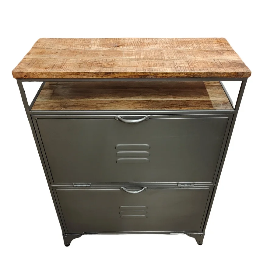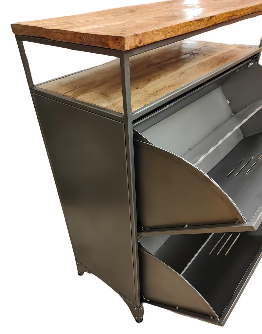 Placé dans l’entrée, le meuble à chaussures en métal et manguier massif ne manquera pas de se faire remarquer. Rivets et aérations… Tout en métal vieilli, il a été pensé pour recréer les mobiliers indus d’antan. Les petits plus de ce meuble à chaussures ? Ses deux grands tiroirs, qui garderont vos souliers à l’abri, et sa niche et avec le dessus du meuble en manguier massif, qui mettra en valeur une plante ou un bel objet déco.