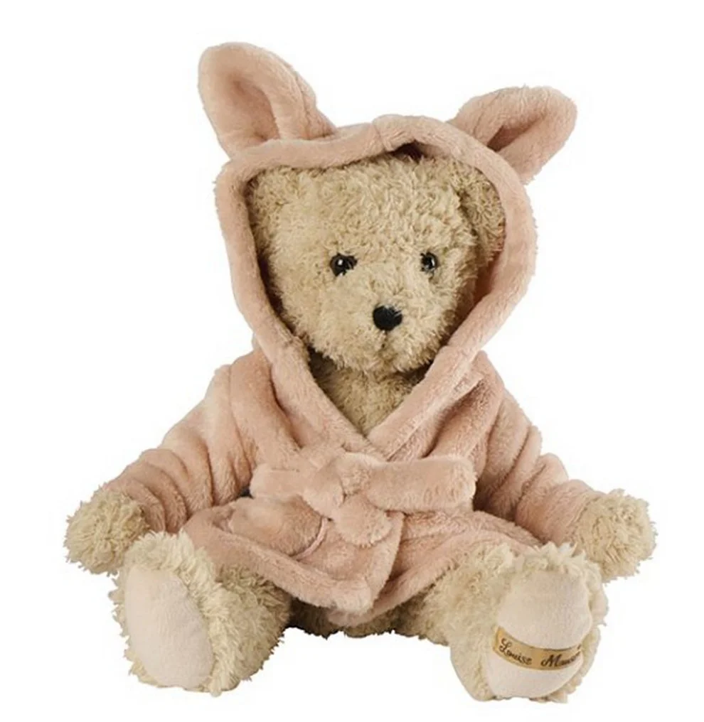 Peluche Ours beige nommée Enéa en peignoir rose.