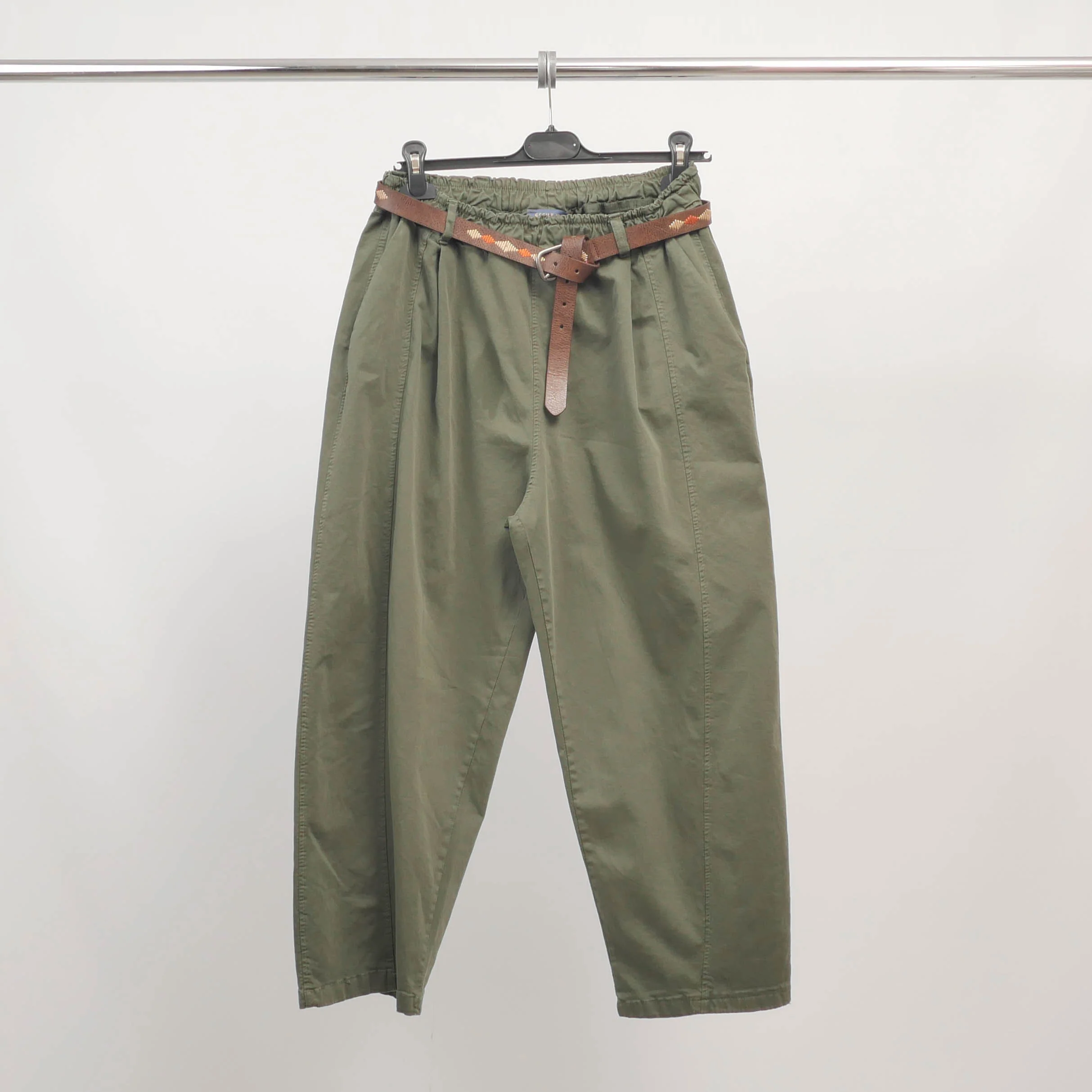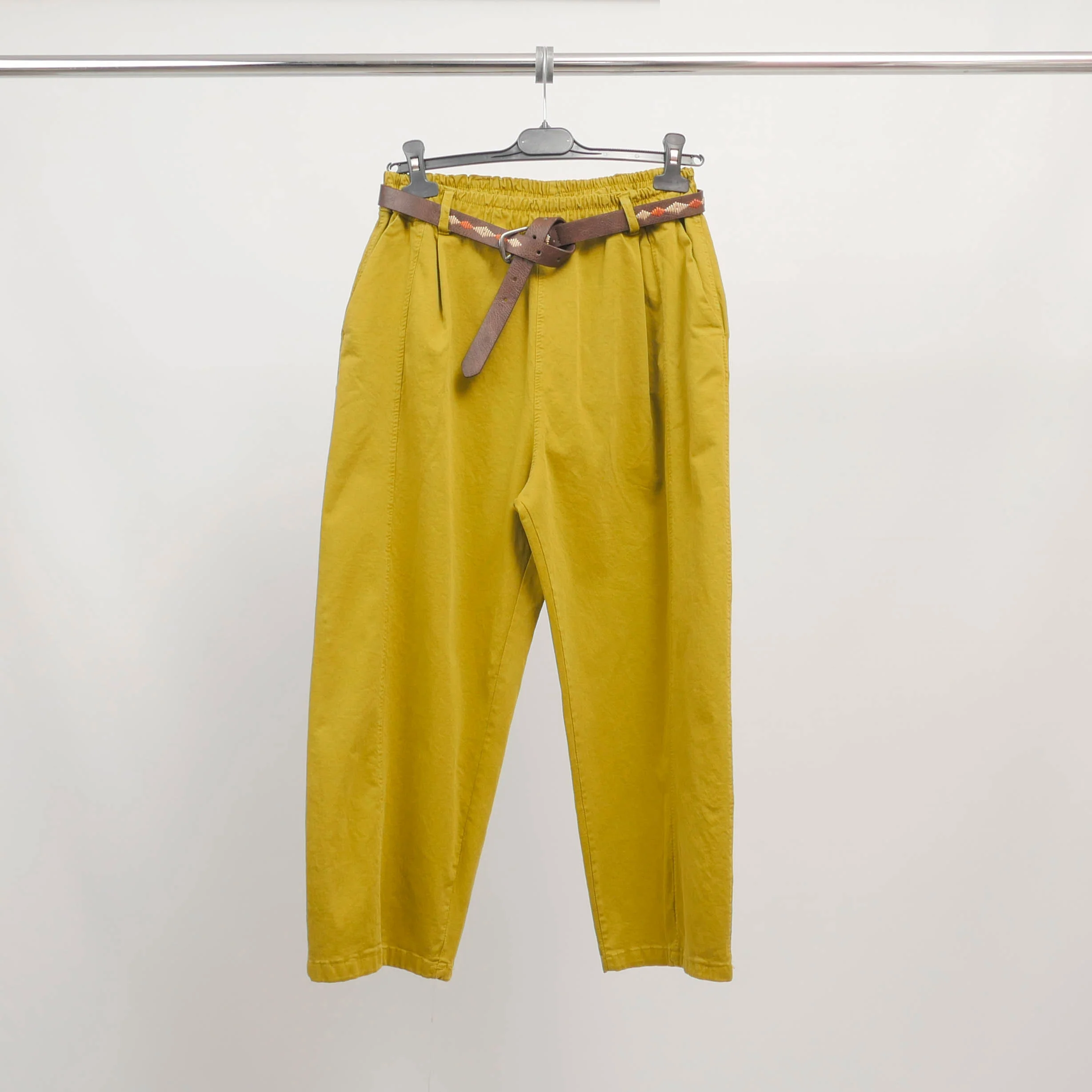 Sa coupe carotte, ample sur les hanches et resserrée à la cheville, flatte la silhouette tout en offrant une liberté de mouvement optimale. La taille élastiquée est accompagnée d’une ceinture tressée contrastante, apportant une touche authentique et élégante. Entièrement confectionné en coton, il garantit confort et respirabilité.