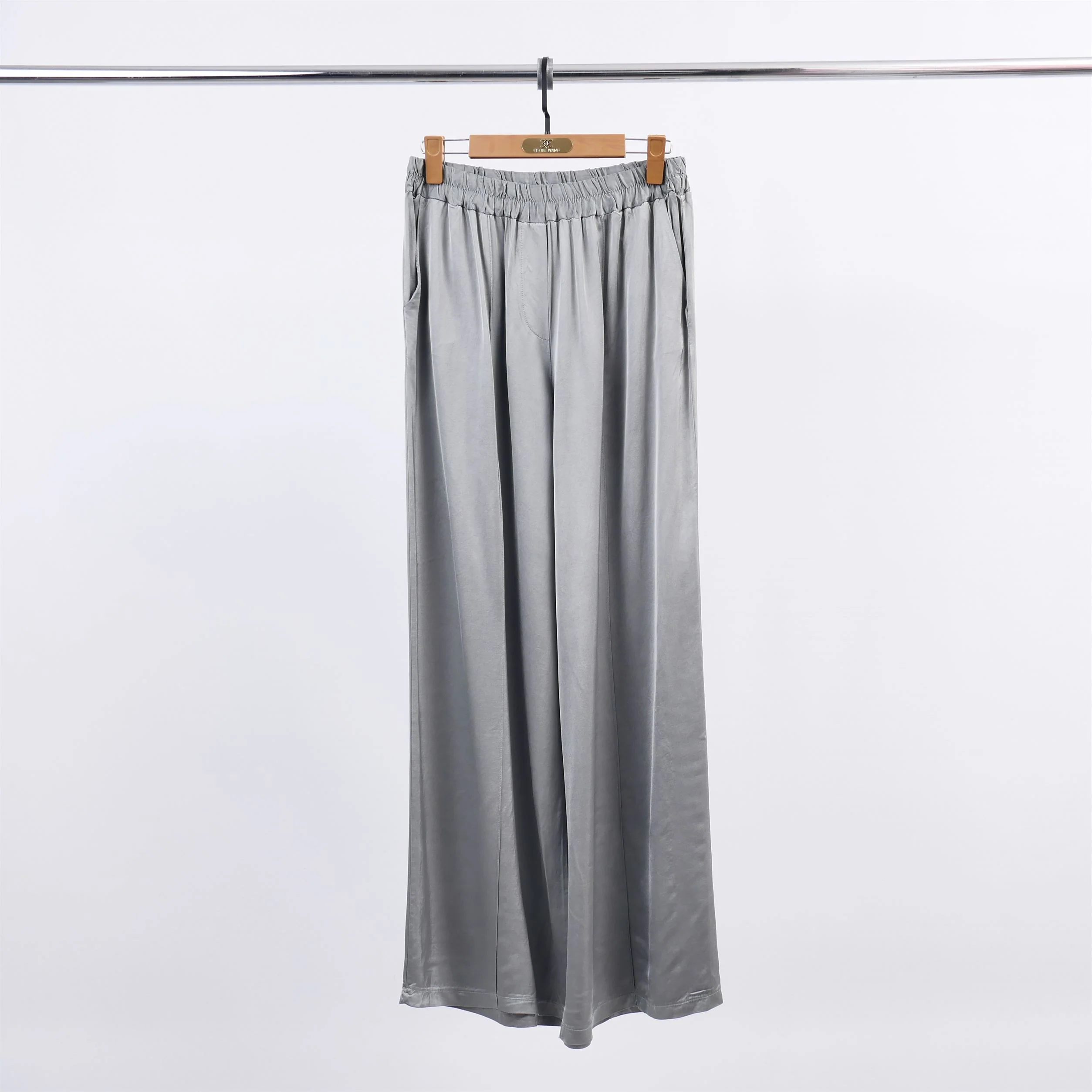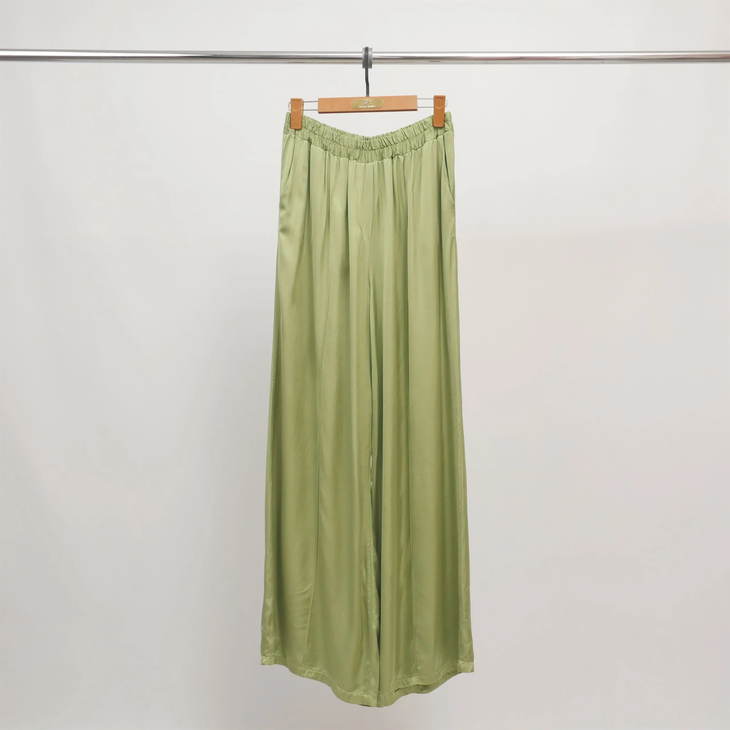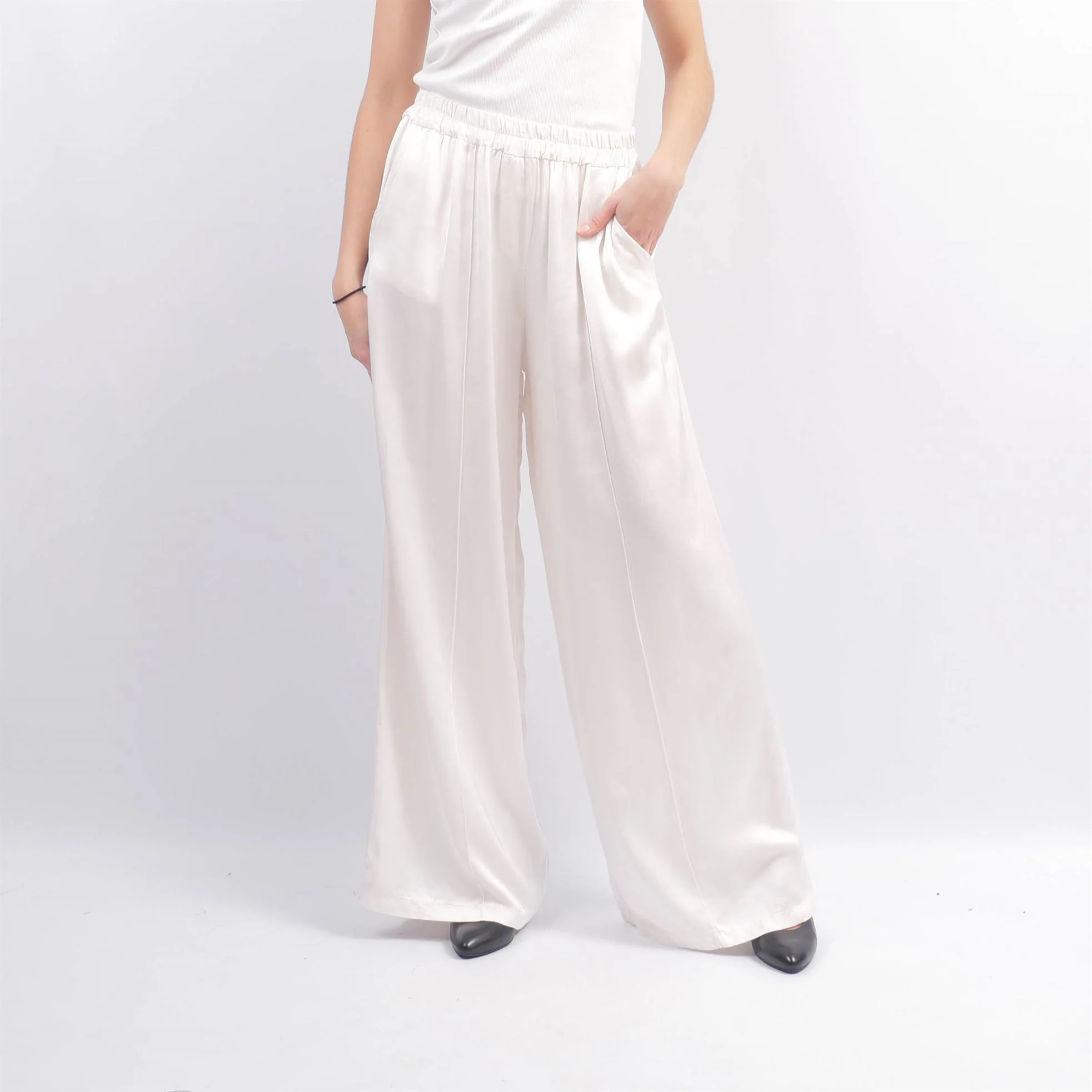 L’élégance fluide s’invite dans votre dressing avec ce pantalon large à la brillance satinée. Décliné en vert doux ou en ivoire lumineux, il séduit par sa texture soyeuse et son tombé aérien. Sa taille élastiquée et ses plis souples sur l’avant assurent un confort absolu et une silhouette naturellement élancée.