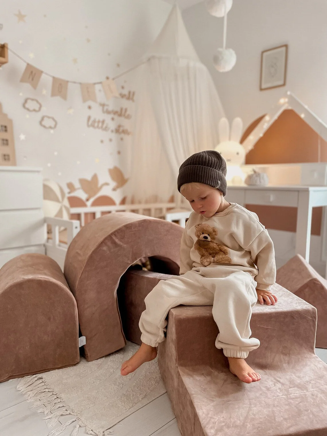 Avec ses modules aux formes variées et rembourrés en mousse, le parcours de motricité est idéal pour créer chez soi une aire de jeu que nos enfants modifieront au gré de leurs envies.
