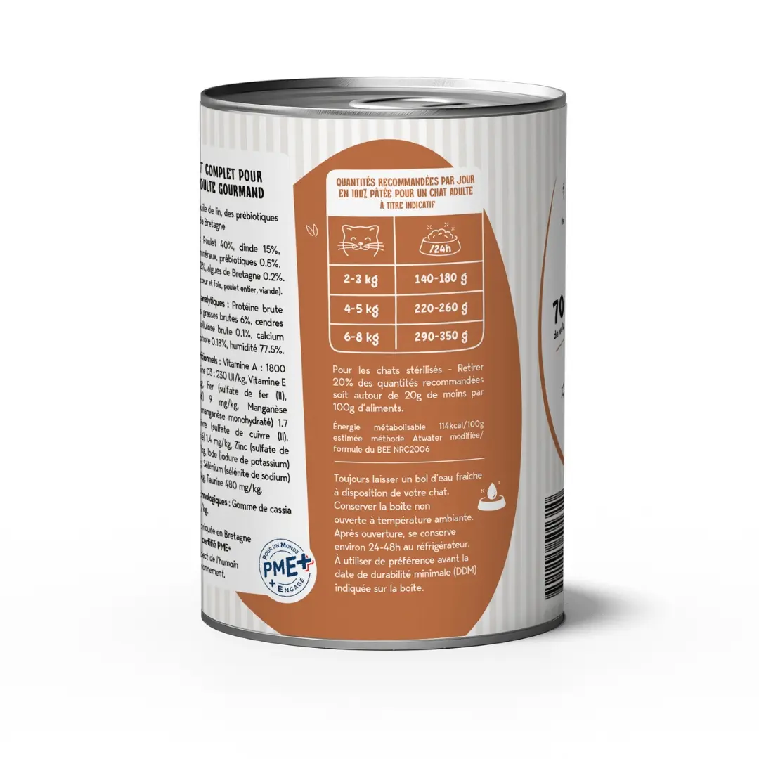Cette pâtée constitue un repas sain et complet à base de viandes et d’abats, respectant la nature carnivore de nos félins domestiques..
