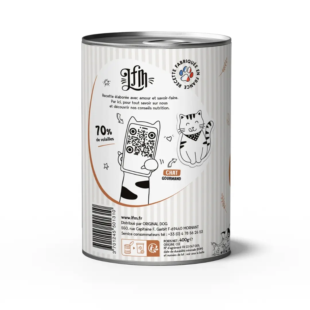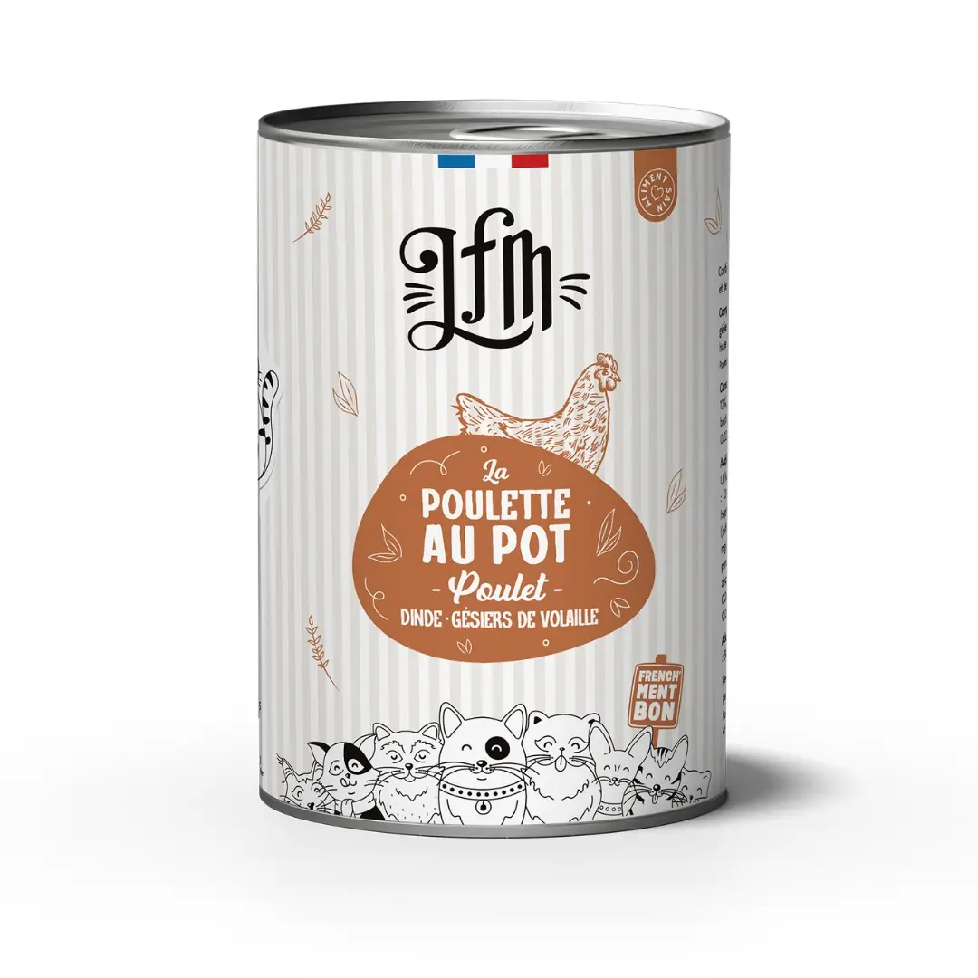 La pâtée pour chats adultes La Poulette au pot de la marque LFM est un aliment humide complet, sain et équilibré qui saura faire frémir de plaisir les moustaches des plus gourmands.