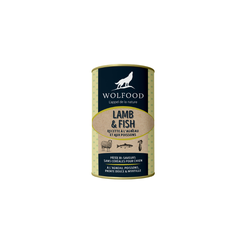Cette pâtée pour chien bi-saveur Lamb & Fish pour chien de WOLFOOD avec plus de 75% d’agneau et de poissons savoureux (maquereau & hareng) pour apporter des protéines complémentaires de haute qualité et des oméga 3 essentiels !