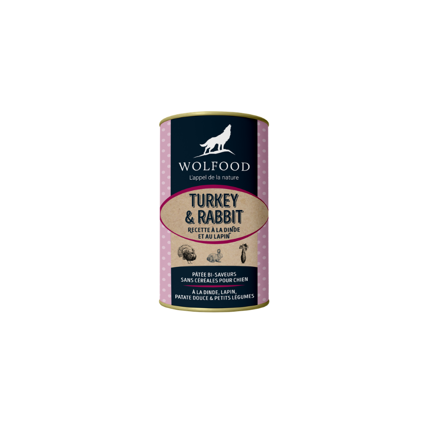 Cette pâtée pour chien bi-saveur Turkey & Rabbit pour chien de la marque WOLFOOD est une recette avec plus de 65% de dinde et de lapin, très riche en protéines de haute qualité à partir de viandes maigres. Elle propose ainsi un aliment complet allégé idéal pour les chiens peu actifs ou en surpoids voire les chiens sensibles.