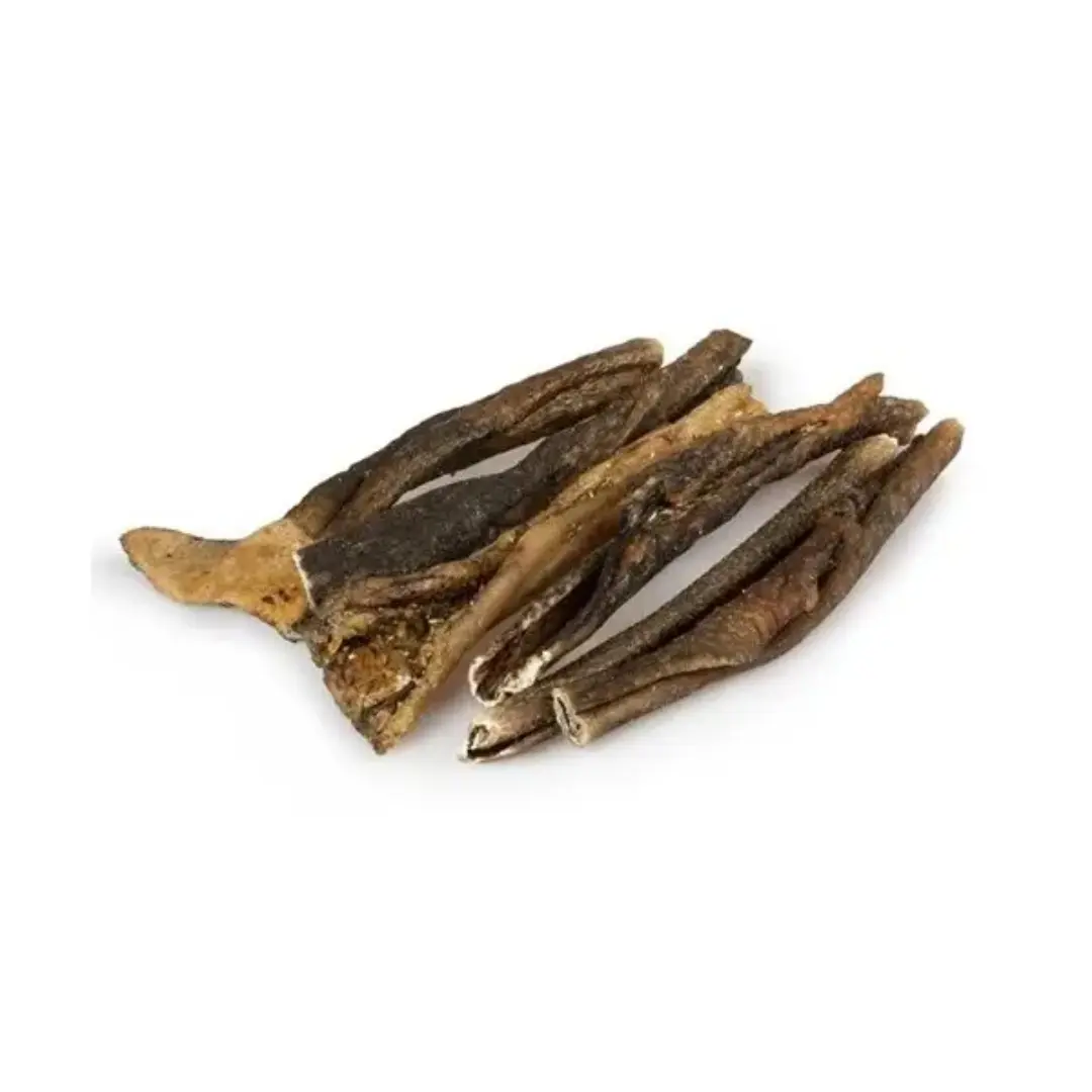 Contrairement aux peaux brutes, souvent ultra-transformées et risquées, la peau de cerf est un produit entièrement naturel, sans odeur excessive ni résidus graisseux. Grâce à un séchage lent et délicat, elle conserve toutes ses propriétés nutritives et sa texture résistante, garantissant une mastication longue et saine.
