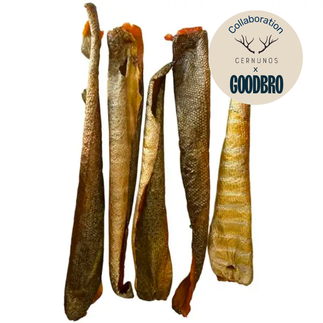 Découvrez les peaux de truite séchées pour chien Goodbro x Cernunos, assurant une source de nutrition saine et naturelle pour votre fidèle compagnon. Abondante en oméga-3 essentiels, cette friandise favorise la santé cardiaque, la brillance du pelage et le bien-être global de votre chien.
