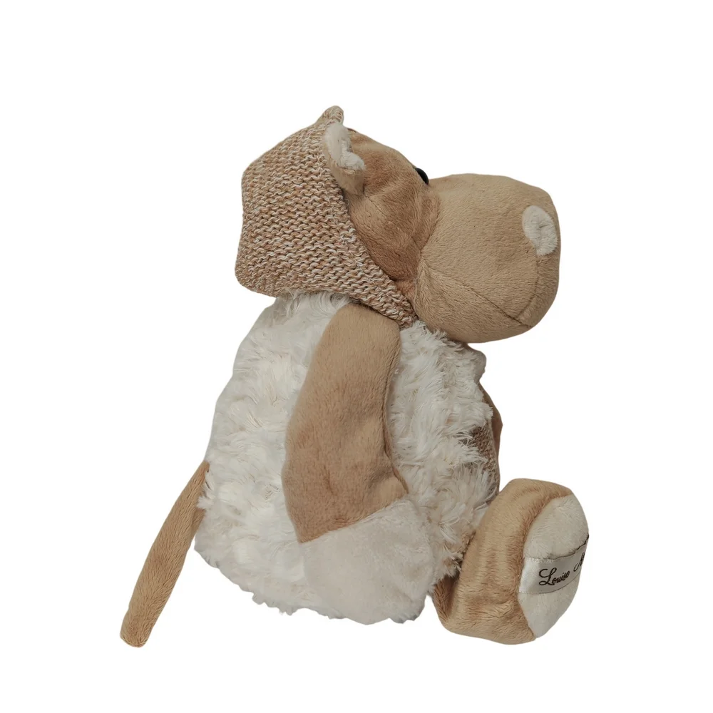 Il a des fossettes de couleur écru. Son ventre est fait avec un tissu qui est une matière bouclette de couleur écru avec une poche en lainage marron.