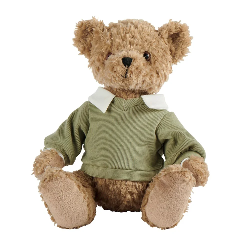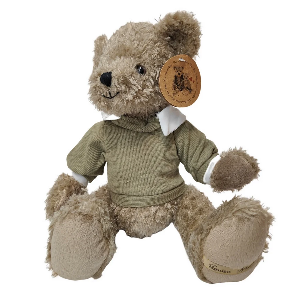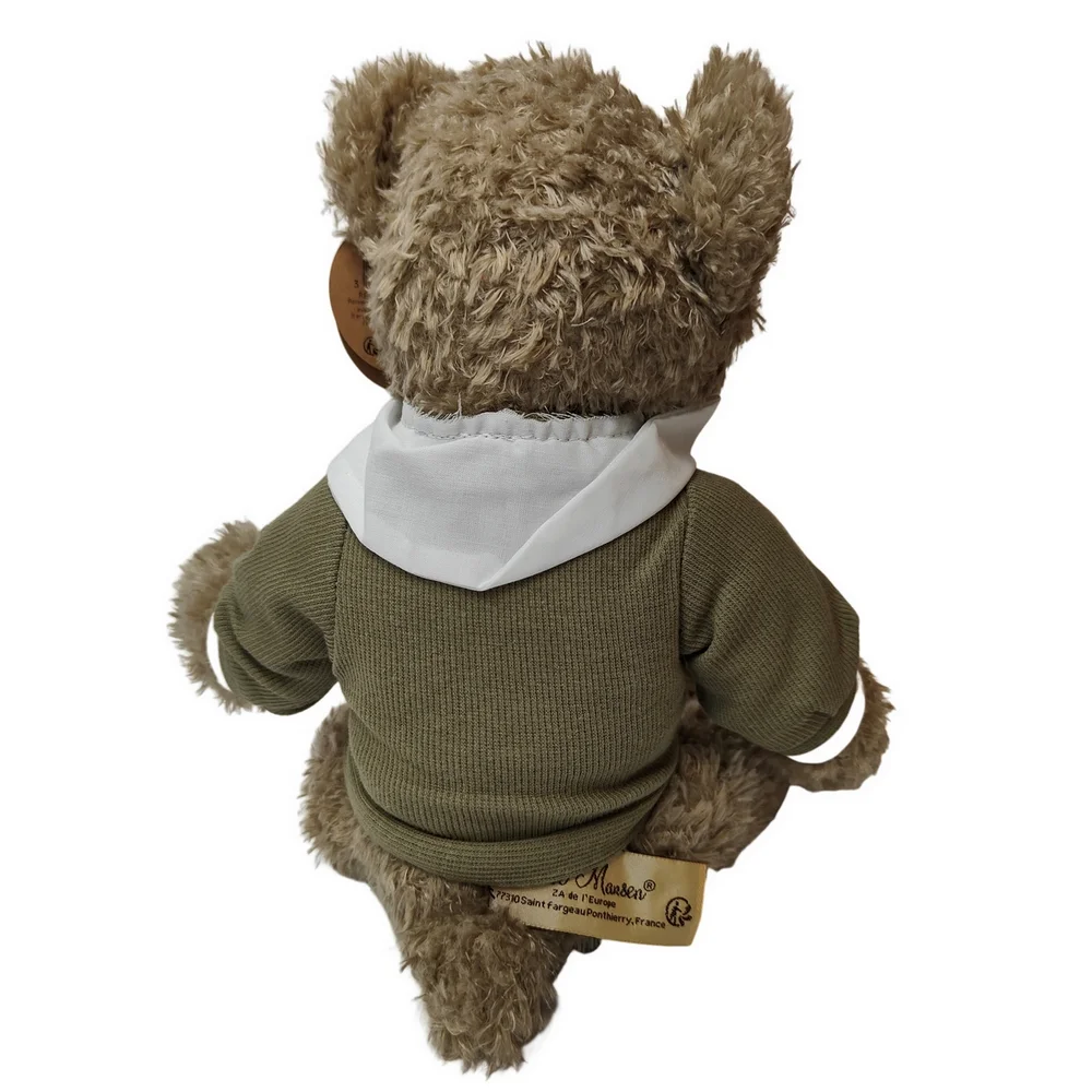 Adorable peluche d’ours brun qui s’appelle Yowan de 26 cm de hauteur avec son pull vert à col blanc. De la marque Louise Mansen
