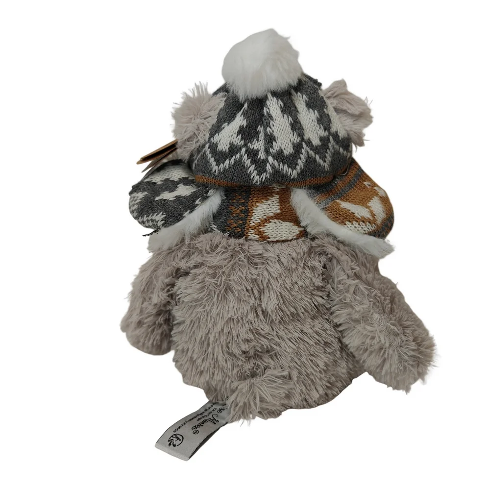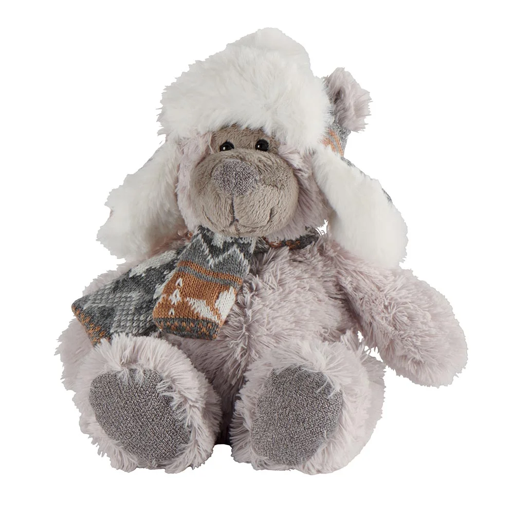 Ours en peluche gris clair avec son chapka et son écharpe en laine jacquard gris marron et blanc, nommé Arslan