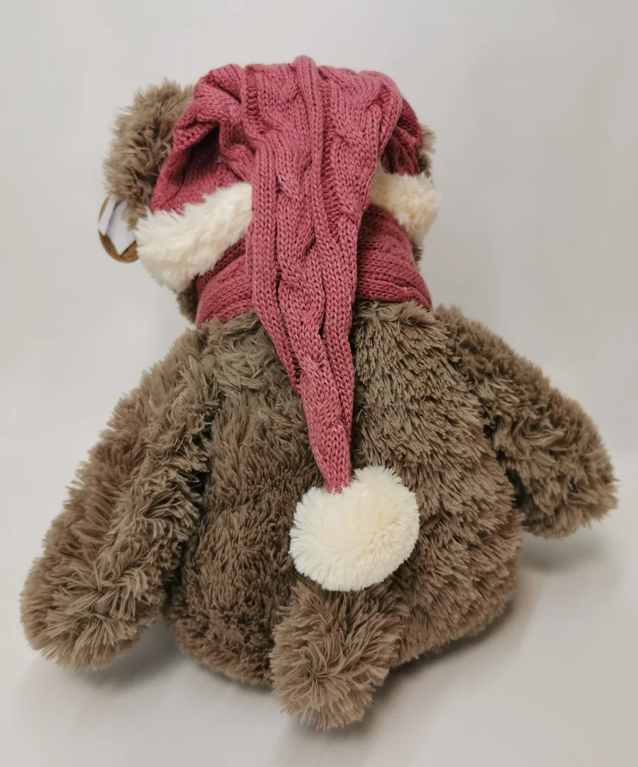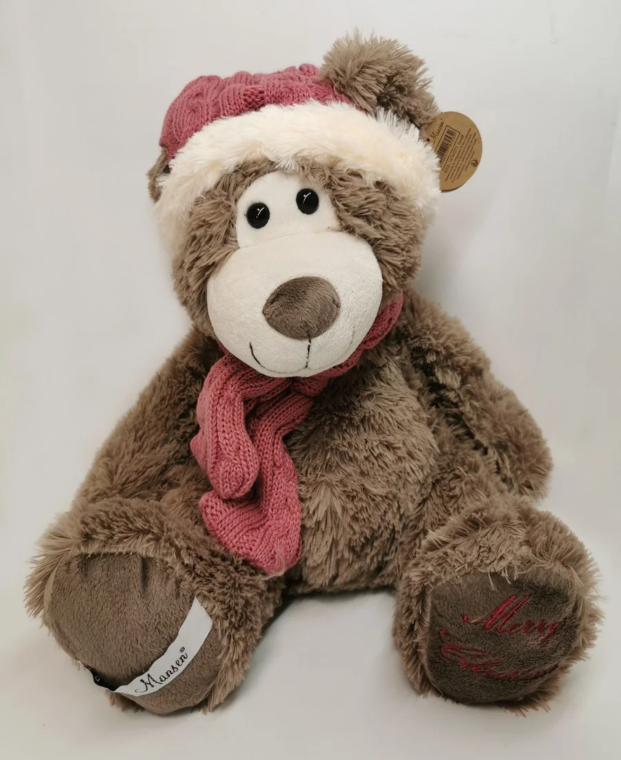 Ours en peluche brun avec son bonnet et son écharpe en laine rose et blanc, nommé Asulf