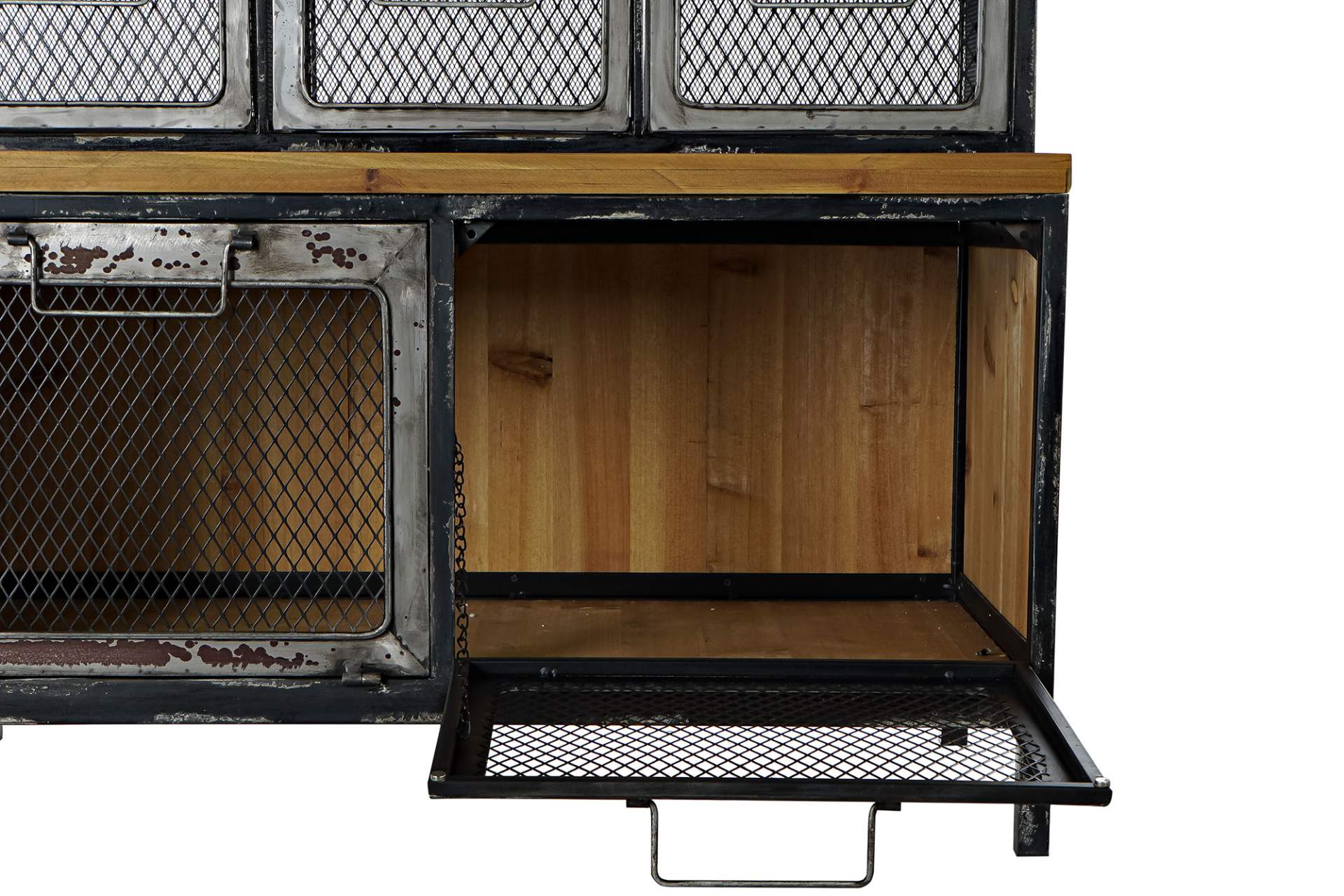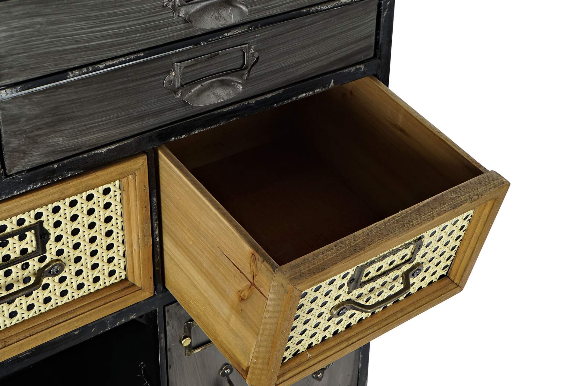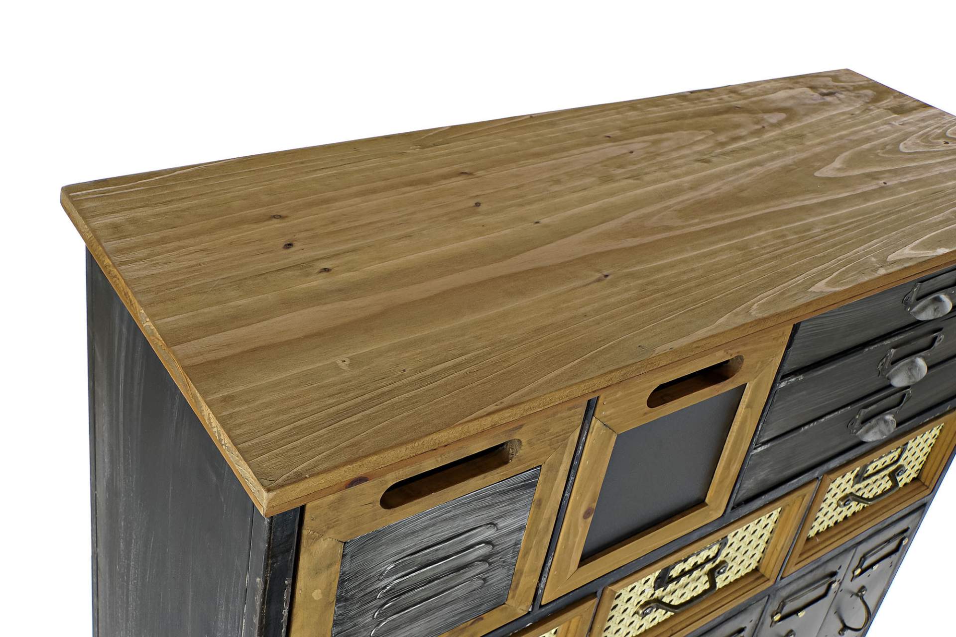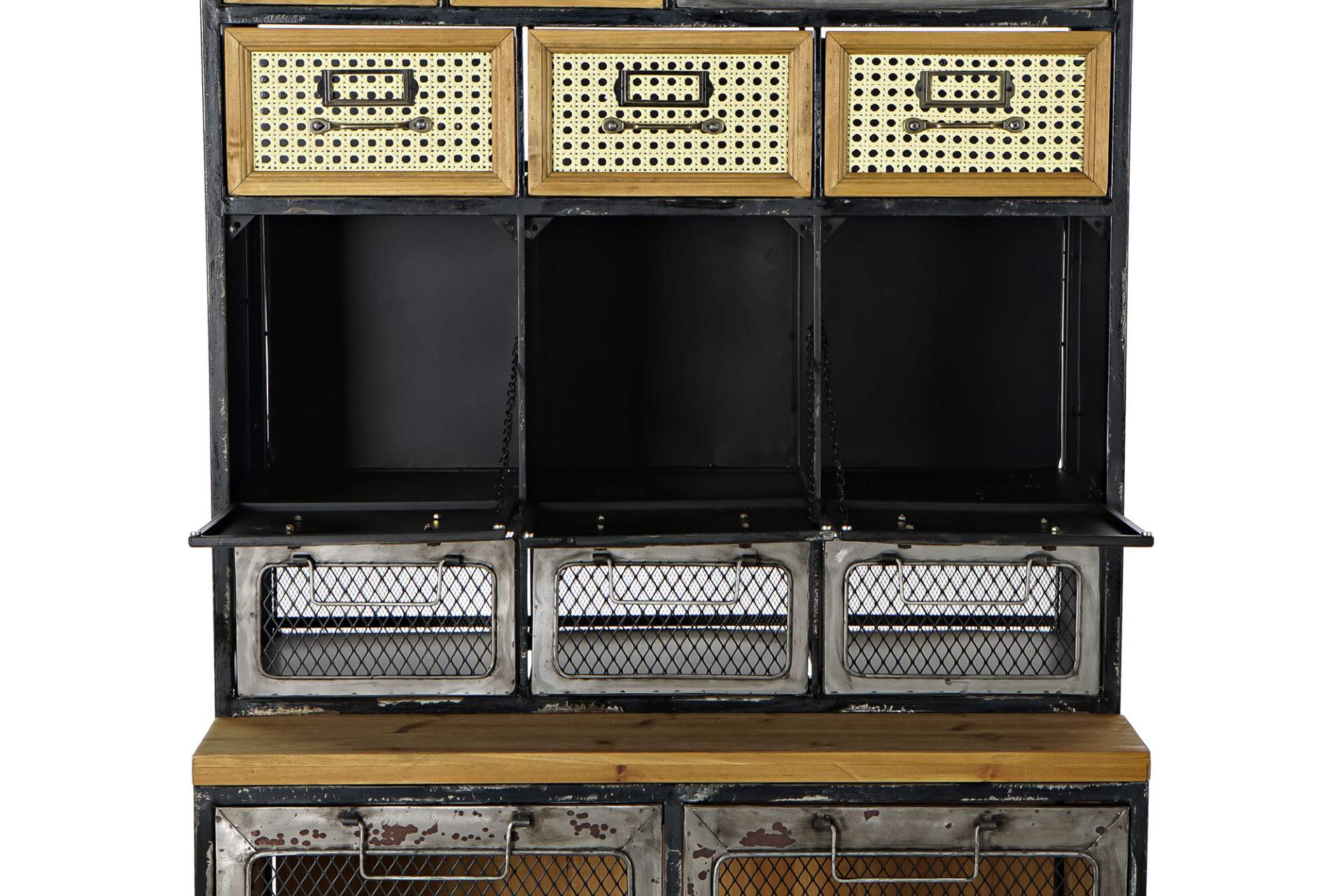 Un meuble commode esprit très industriel en métal aspect zingué ou noir vieilli et bois.