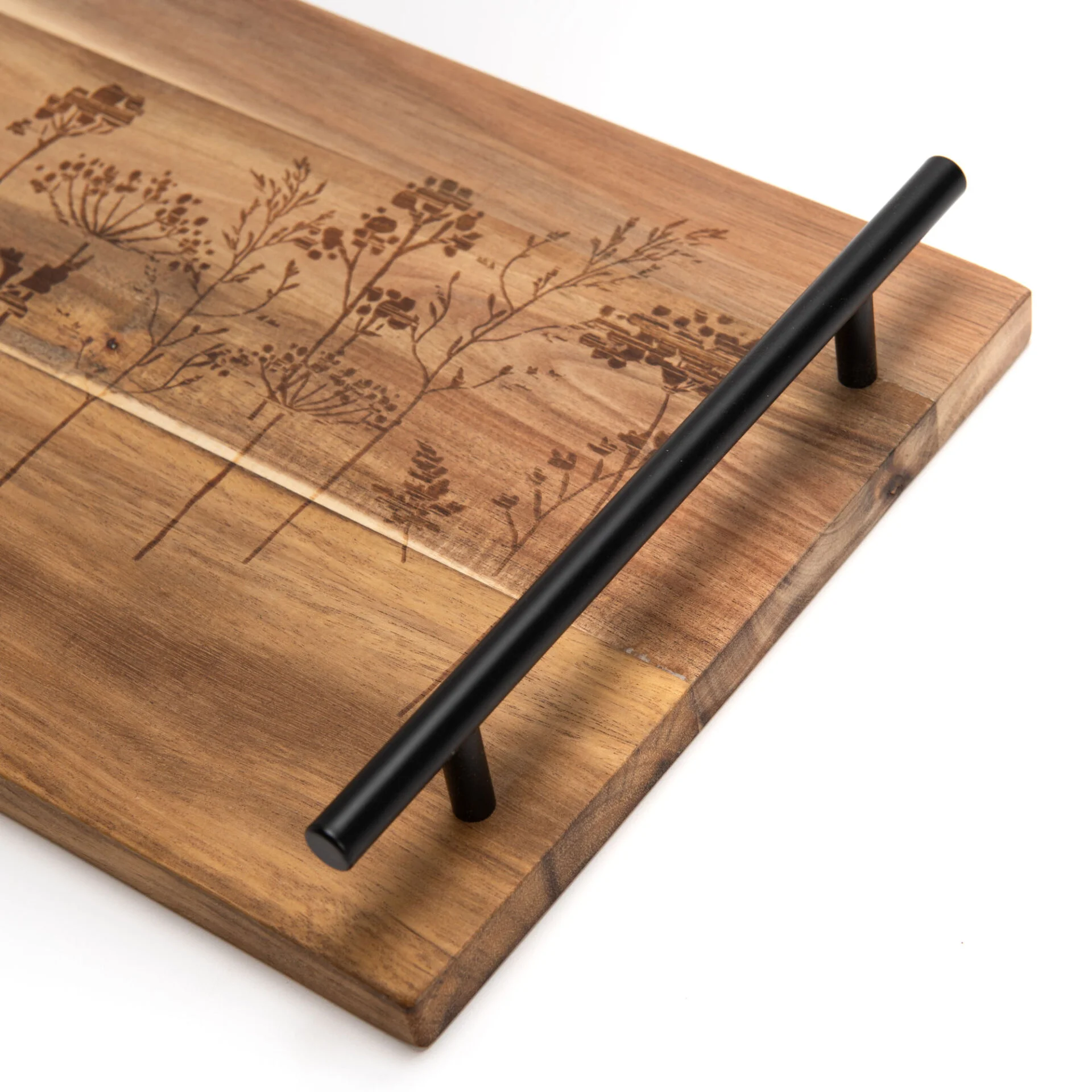 Plateau en bois avec anses en métal noir.