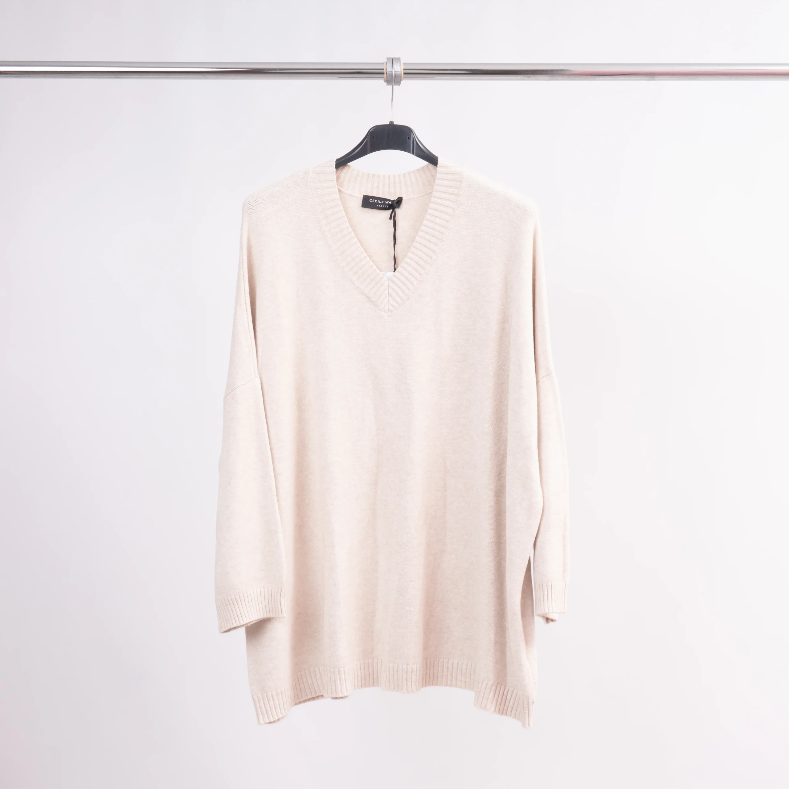 Conçu avec une encolure en V côtelée et des emmanchures légèrement tombantes, il offre un tombé naturel et flatteur pour toutes les silhouettes. Sa maille douce et souple assure un porté agréable au quotidien, tout en conservant une allure soignée.