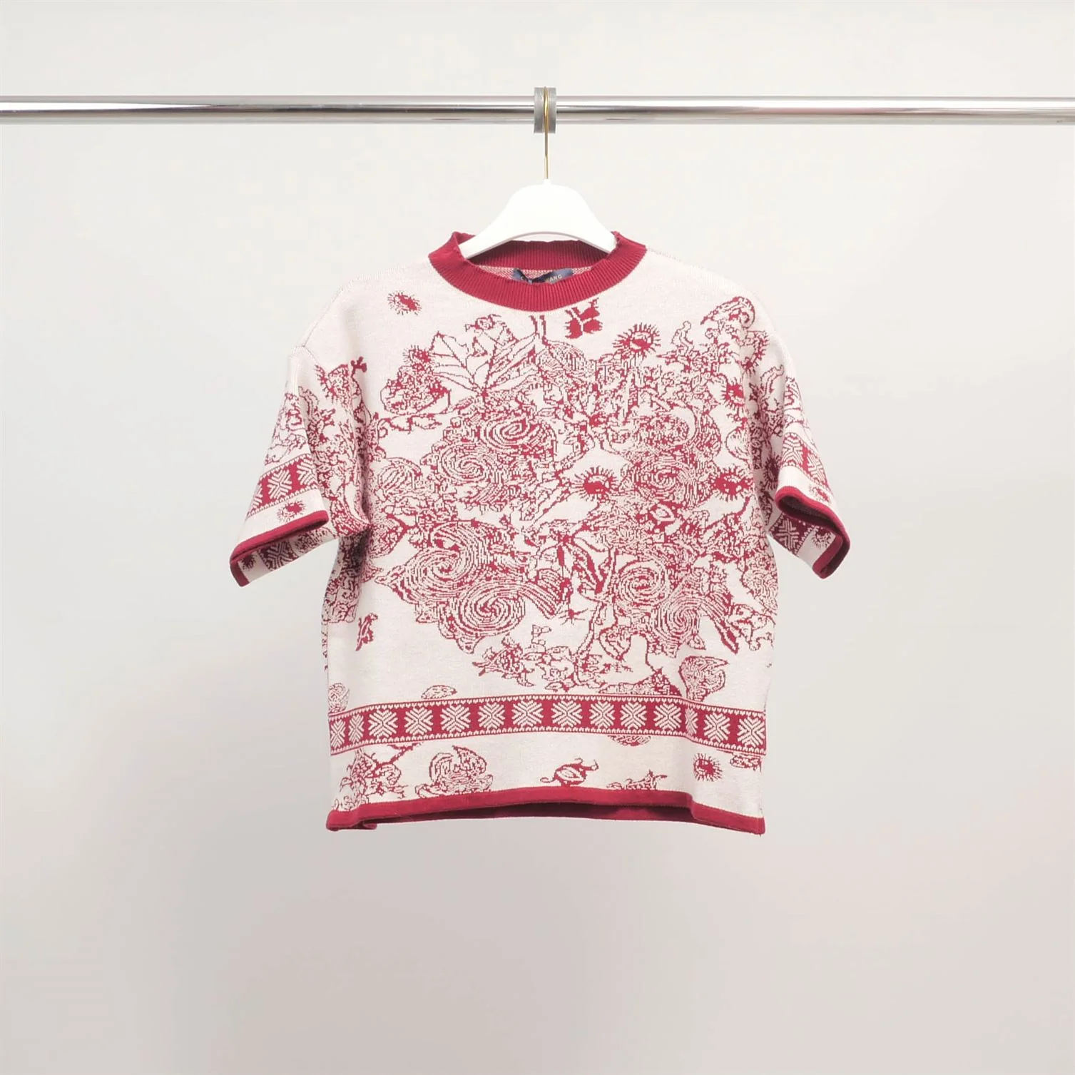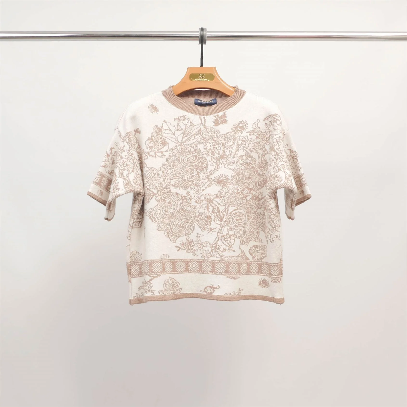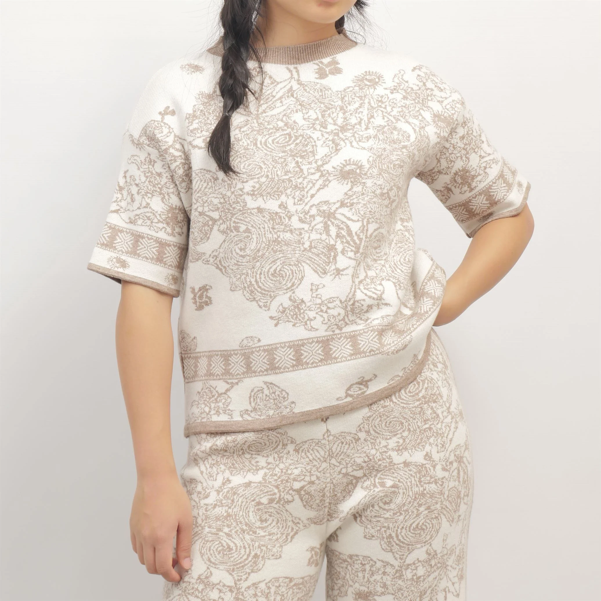 Entre esprit bohème et élégance contemporaine, ce pull à manches courtes séduit par son motif floral richement travaillé en jacquard. Sa coupe droite et son col rond côtelé offrent un tombé structuré tout en légèreté, idéal pour la mi-saison. Les bords contrastés soulignent délicatement les finitions, apportant une touche graphique à l’ensemble. À porter seul avec un jean taille haute ou assorti au pantalon coordonné pour un look résolument sophistiqué.