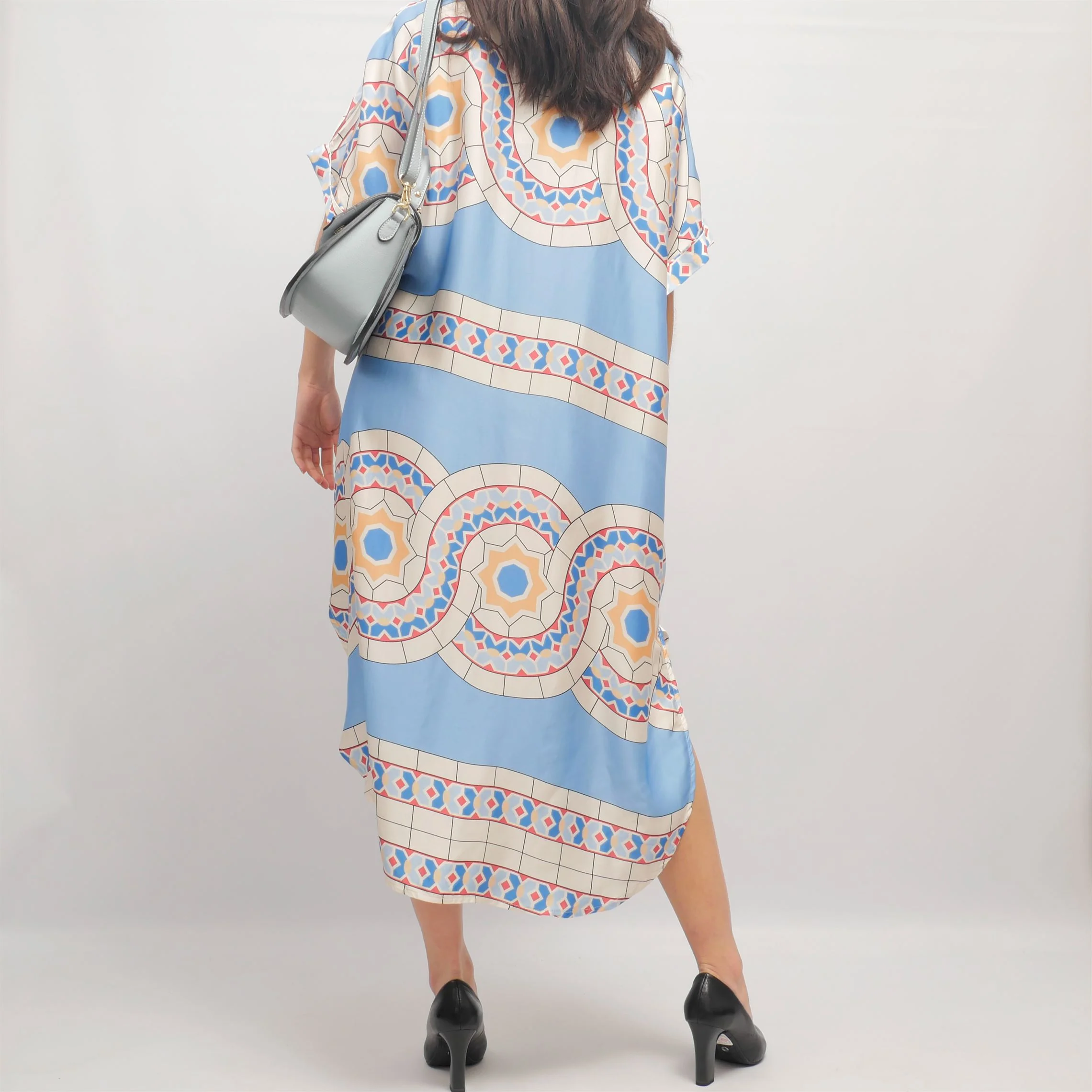 Un vent de modernité souffle sur cette robe caftan aux accents bohèmes et graphiques. Son imprimé géométrique inspiré des mosaïques apporte du caractère et une touche d’originalité à votre tenue. La coupe ample, soulignée par un col en V élégant et des manches courtes légèrement tombantes, flatte toutes les silhouettes avec décontraction. Confectionnée dans un mélange léger et fluide, elle offre un confort incomparable tout au long de la journée. Portez-la ceinturée pour structurer la taille ou laissez-la libre pour un look décontracté. Elle se marie aussi bien avec des sandales minimalistes qu’avec des talons pour une allure affirmée.