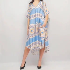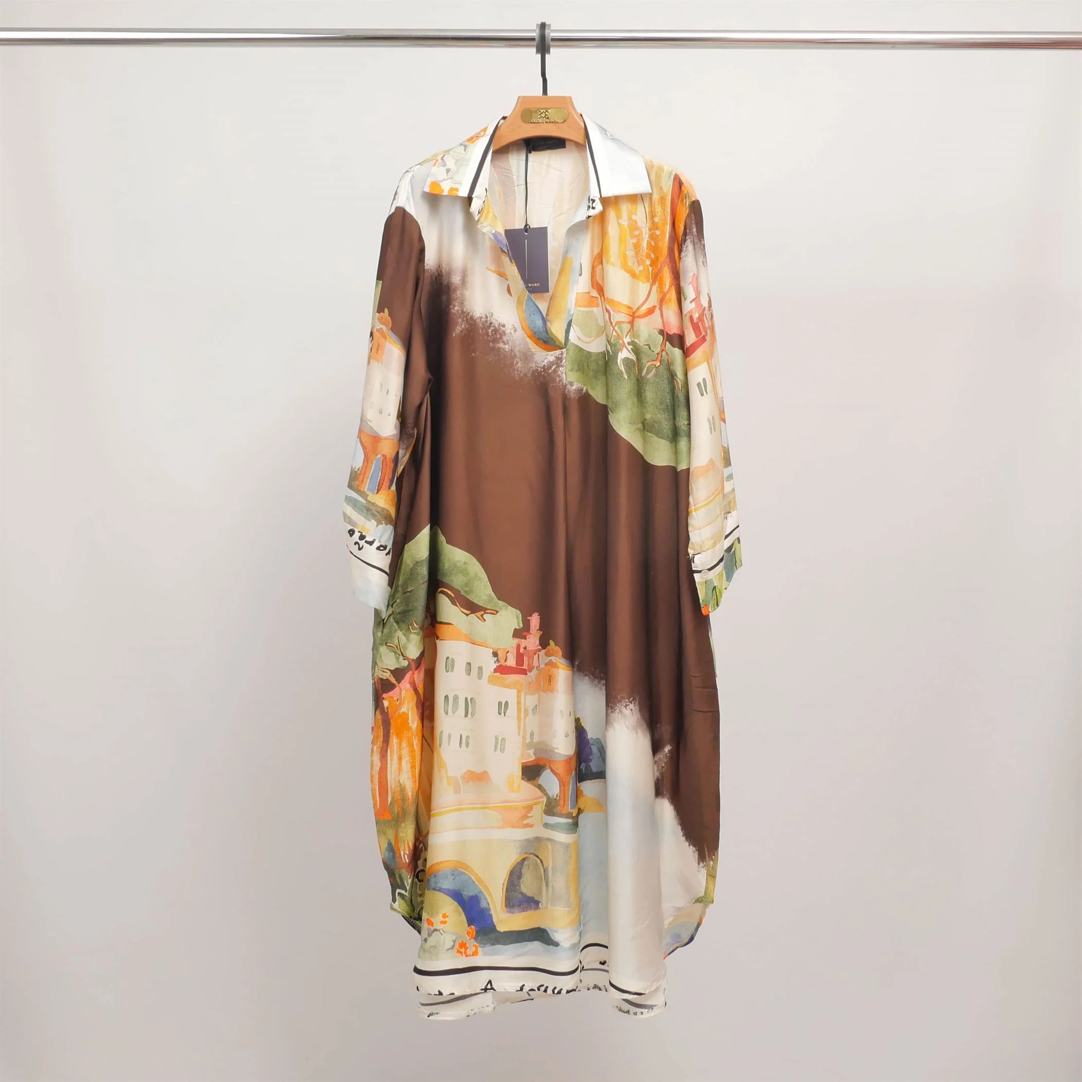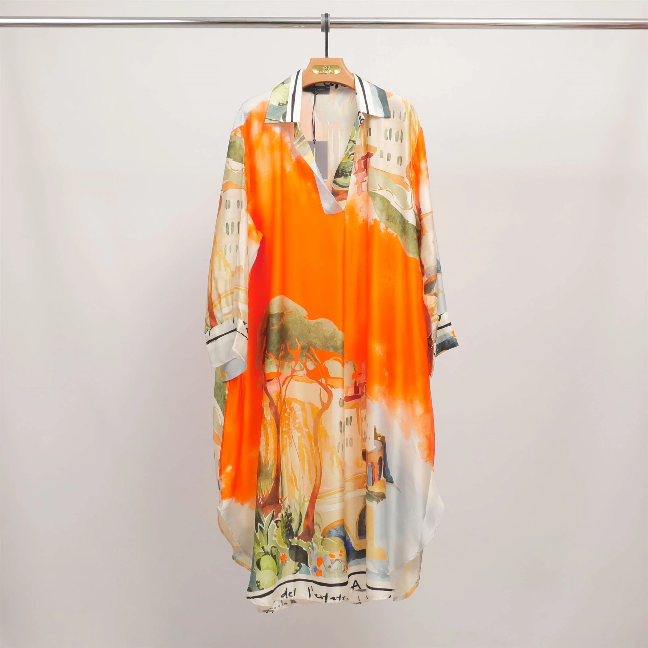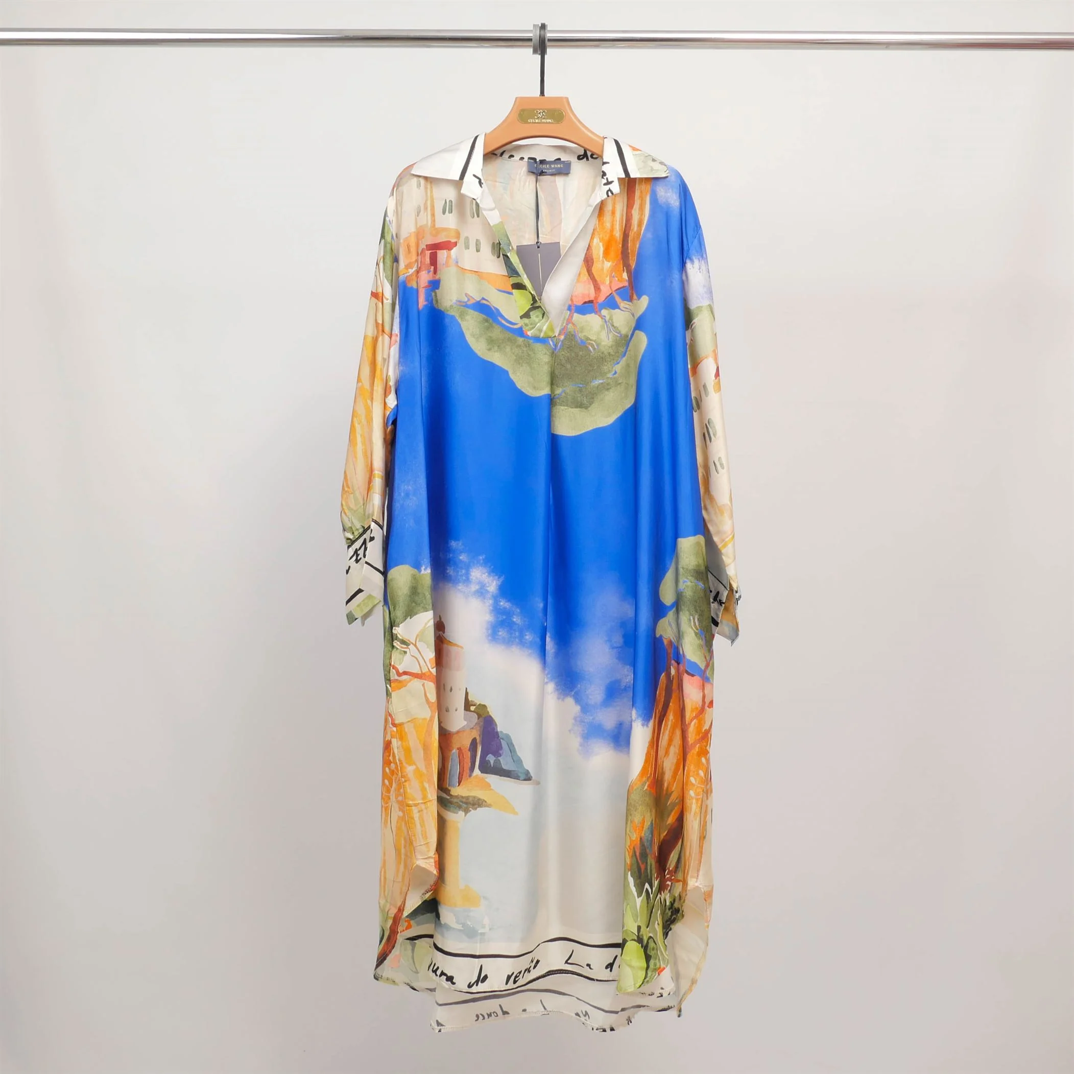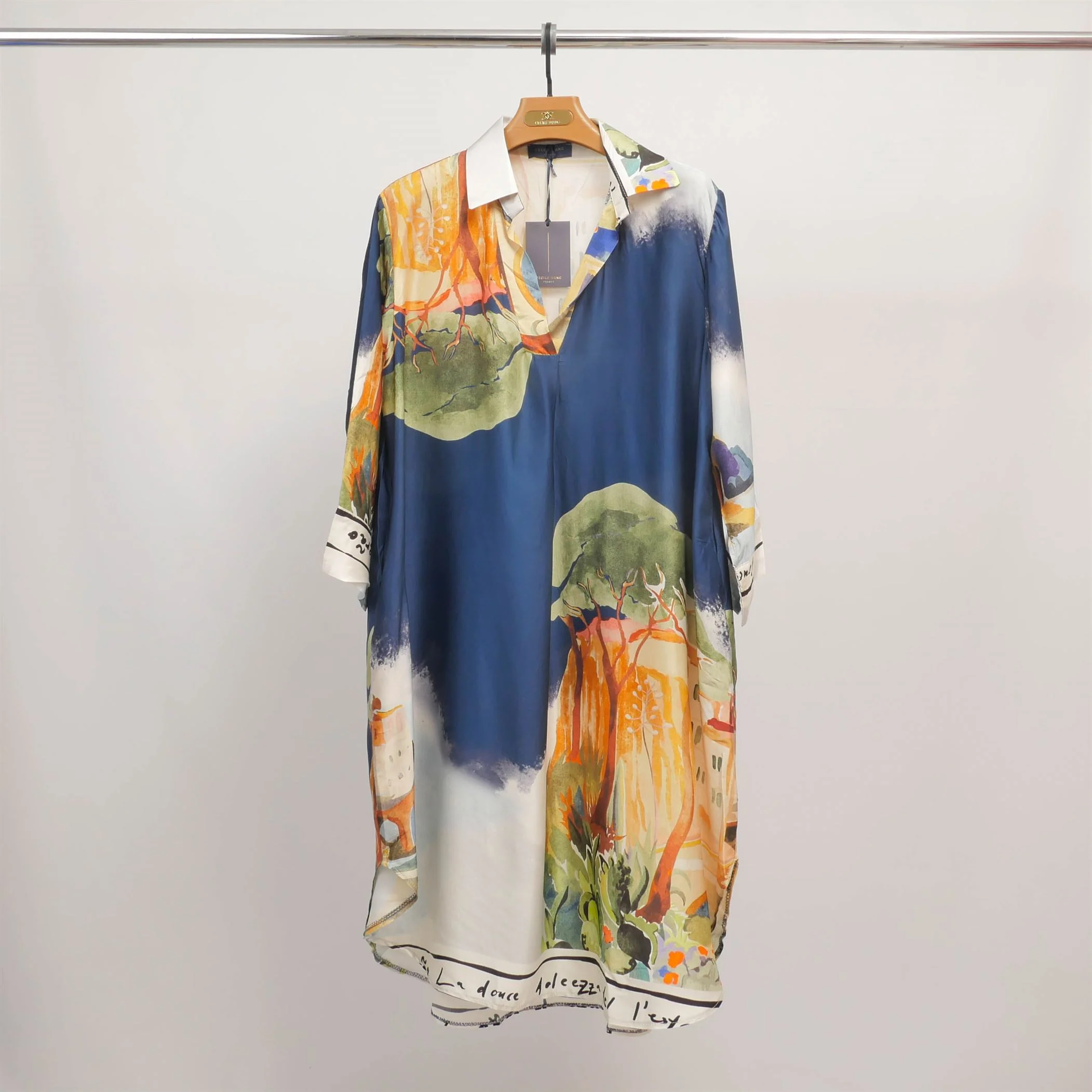Un souffle artistique pour une allure raffinée. Cette robe à manches longues séduit par son imprimé façon aquarelle aux couleurs vibrantes, inspiré de paysages méditerranéens. Conçue dans une coupe fluide et ample, elle présente un col chemise structuré et une encolure en V subtilement féminine. La matière légère offre un tombé soyeux et une sensation agréable sur la peau, parfaite pour les journées estivales ou les soirées en bord de mer. Portez-la avec des sandales plates pour un look décontracté ou ceinturez-la avec des talons pour une silhouette plus habillée.