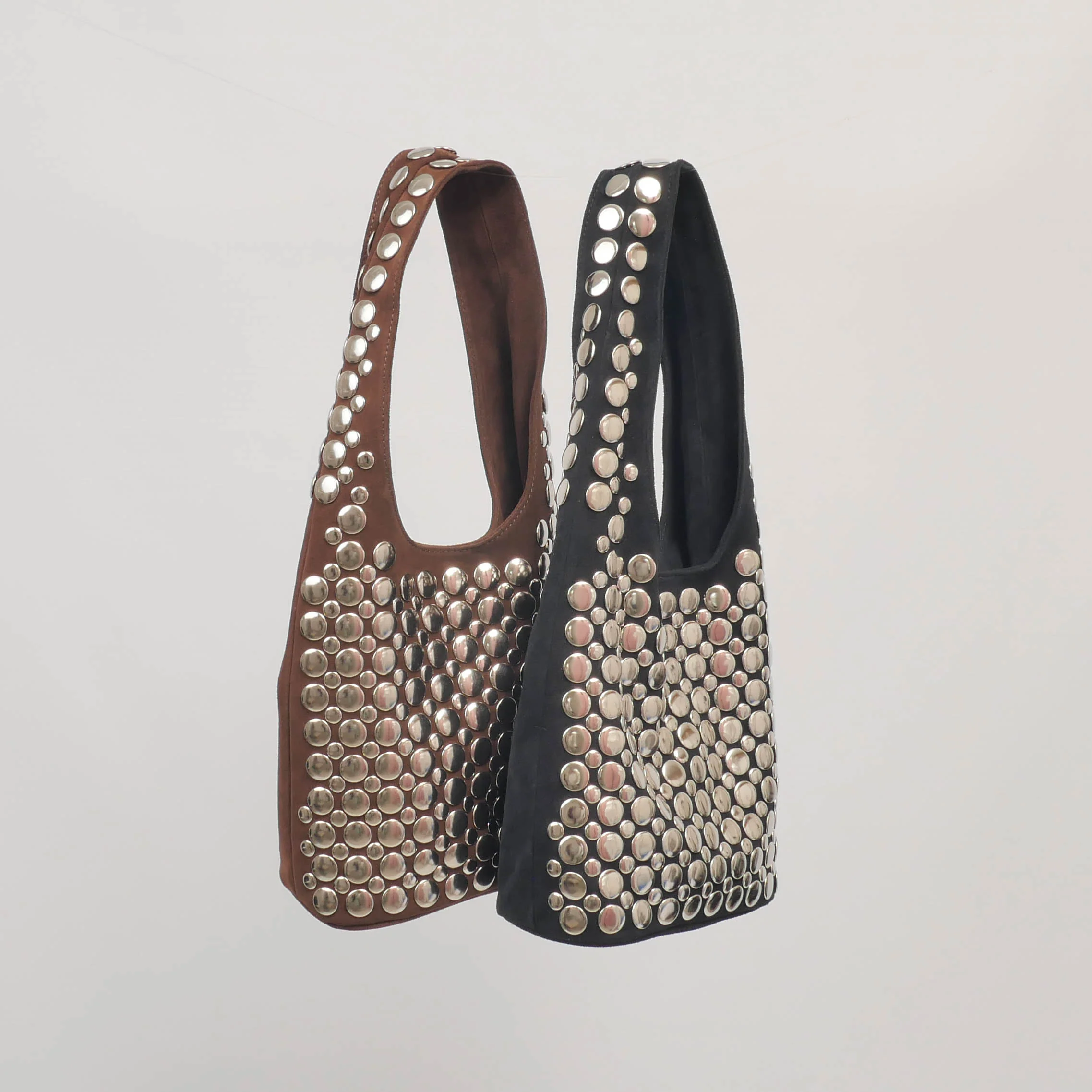 Une pièce forte qui bouscule les codes du sac classique. Ce sac épaule en cuir effet daim se distingue par son design audacieux entièrement orné de clous métalliques bombés, pour un look résolument rock et contemporain. Sa silhouette souple et compacte, avec anse large intégrée, épouse parfaitement l’épaule pour un porté confortable au quotidien. Assez spacieux pour vos essentiels, il apporte une touche de caractère instantanée à n’importe quelle tenue, du jean vintage à la robe fluide.