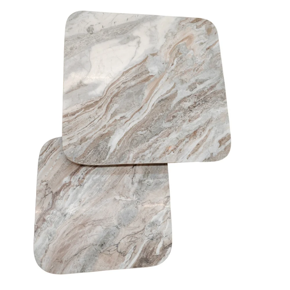 Set de 2 tables basse plateaux marbre naturel, piétement en acacia finition naturel vernis.