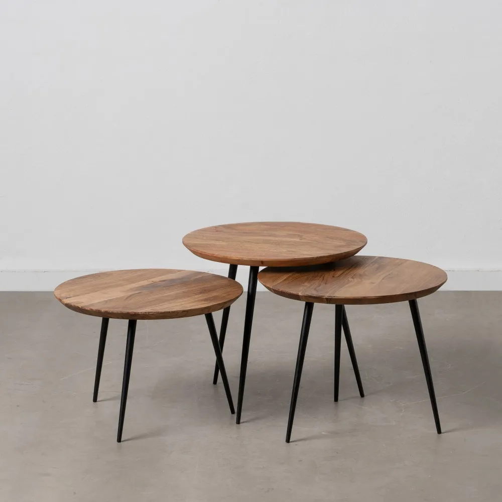 Bel ensemble de trois tables basses gigognes en bois d’acacia d’un diamètre de 50 cm. Avec un look épuré contemporain, ces trois tables pourront être utilisées en groupe ou séparées selon vos envies de mise en scène. Elles peuvent faire office de tables basses ou de supports pour vos objets décoratifs ou plantes. Craquez pour ce splendide set de tables gigognes en bois d’acacia et de métal poudre noir pour les pieds fusés de chaque table.