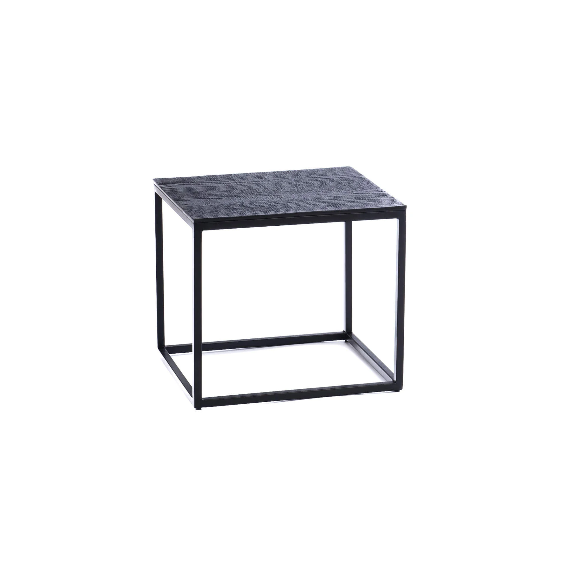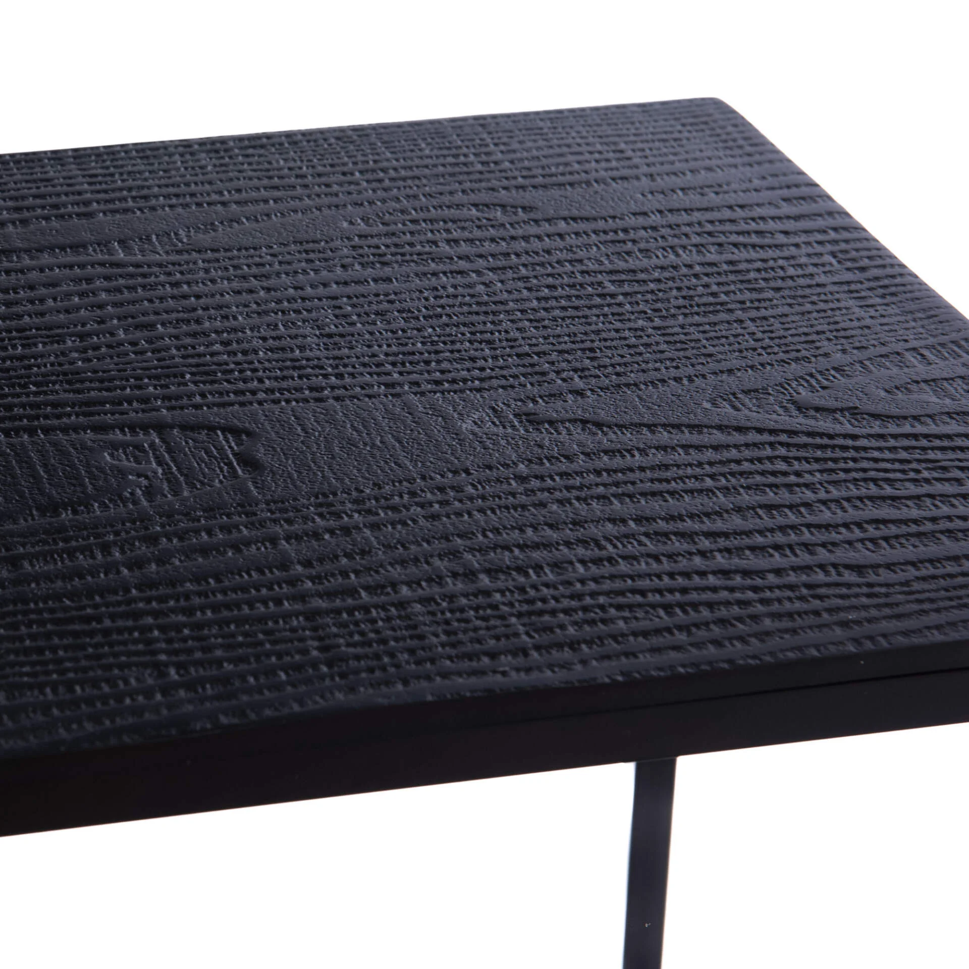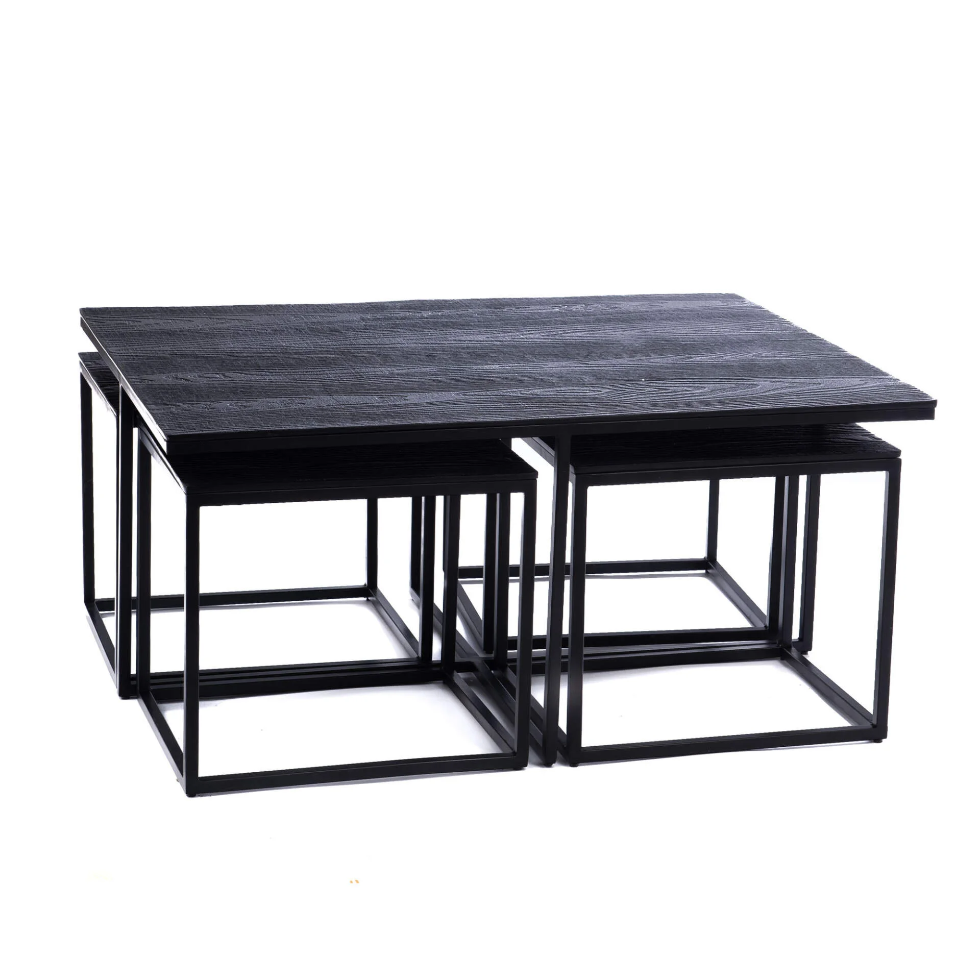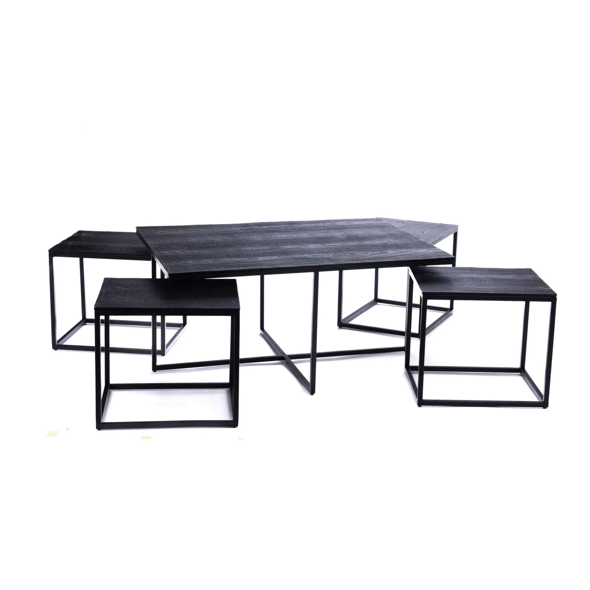 Bel ensemble de cinq tables gigognes en fonte d’aluminium noir aspect bois et fer. L’aspect du piétement en tube carré finition poudre noir s’accorde parfaitement avec les plateaux constitués de fonte d’aluminium noir aspect bois. Avec un look à la fois industriel et vintage, ces cinq tables pourront être utilisées en groupe ou séparées selon vos envies de mise en scène. Elles peuvent faire office de tables basses ou de supports pour vos objets décoratifs ou plantes.