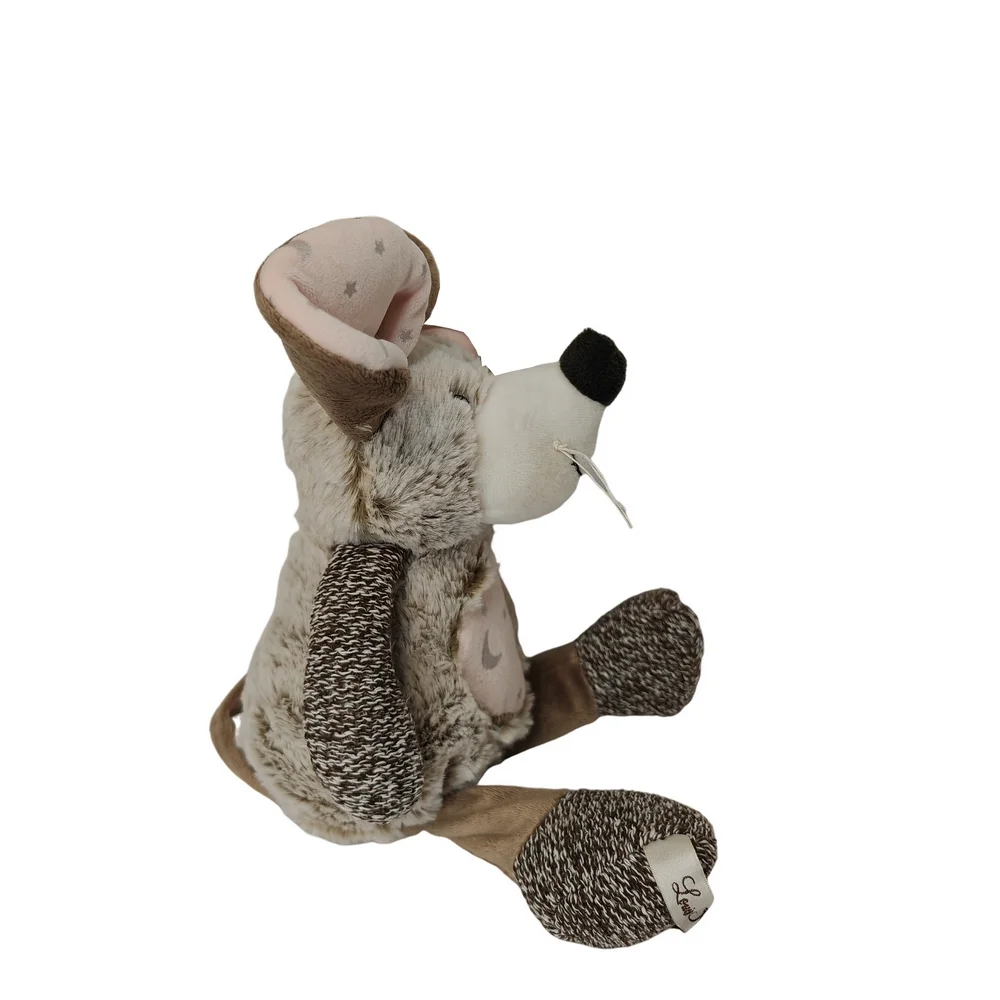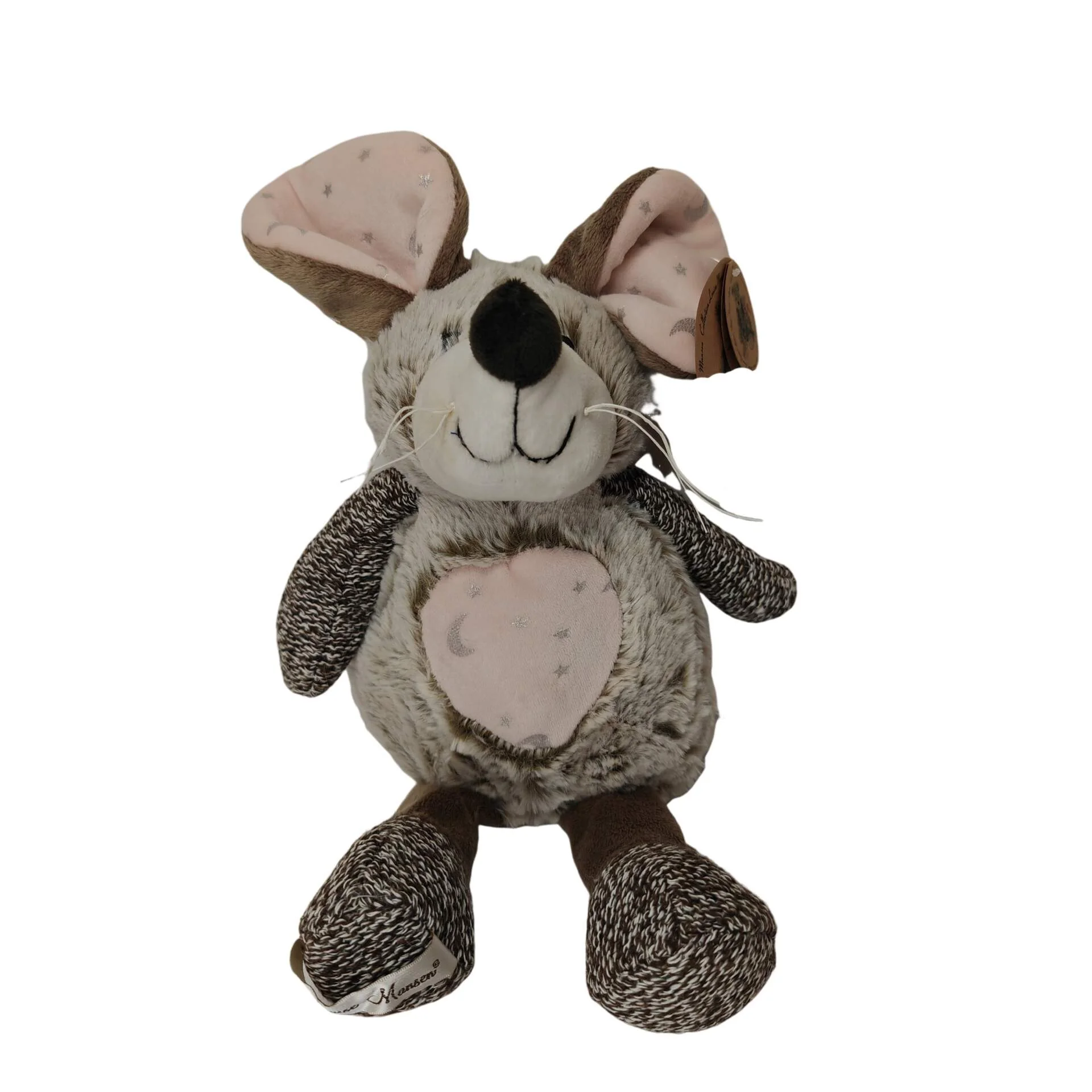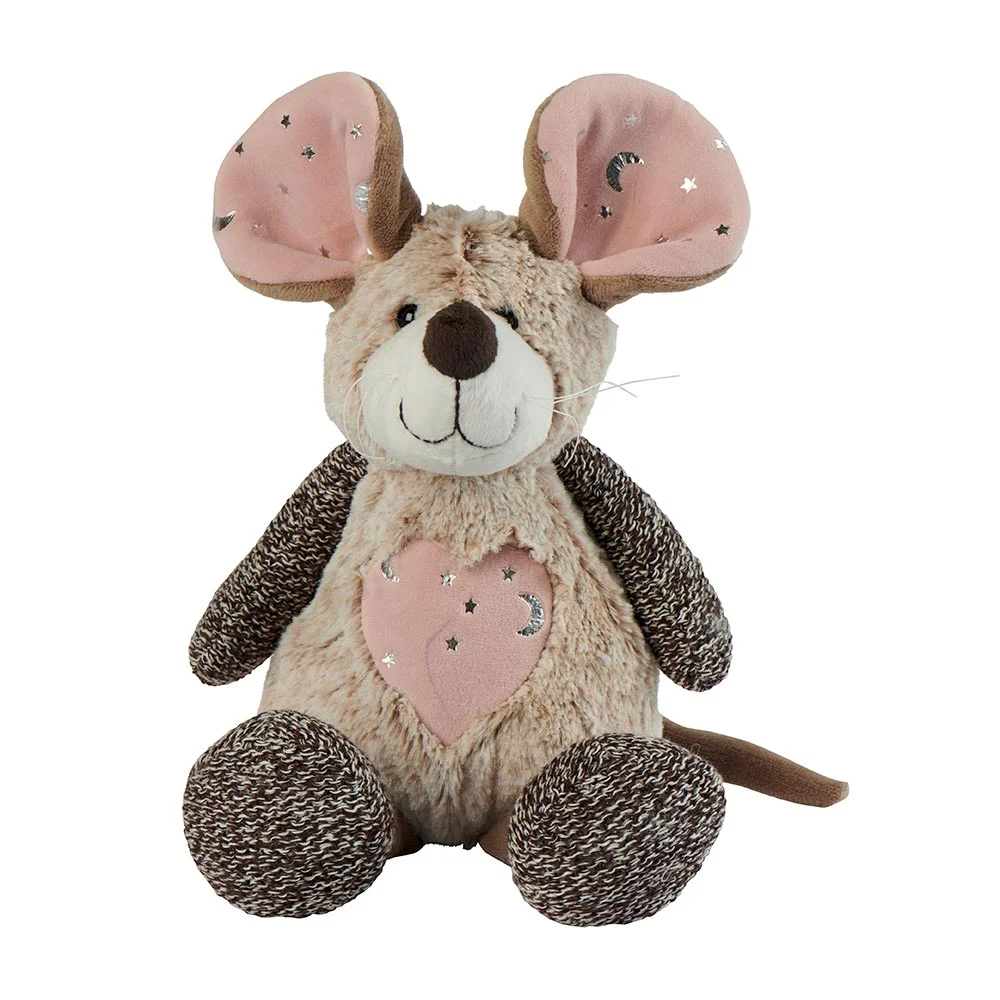Magnifique peluche souris Louise Mansen nommé Nahia au toucher très agréable, qui ravira les petits ou trouvera sa place en décoration de chambre. Elle accompagnera votre enfant dès sa naissance. Une souris marron avec un cœur rose pailleté sur le ventre, oreilles rose et pailleté.