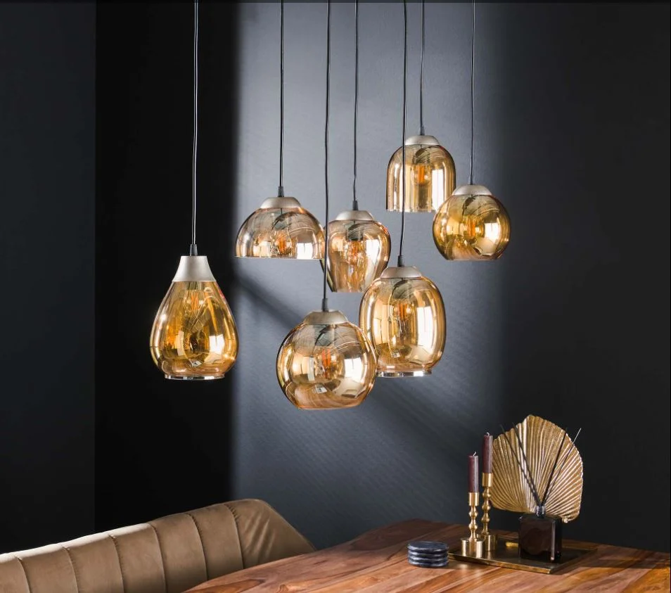 Voila une suspension originale et moderne pour éclairer votre salon ou votre séjour avec style. Ses 7 verres perle de formes différentes couleur ambre équipés de douille type E27 pour ampoules, Les verres avec un bel effet et une forme différentes pour chaque pièces . Les suspensions sont réglable en hauteur jusqu’150 cm Sa structure permettra un éclairage efficace et très décoratif, dans un style très tendance.