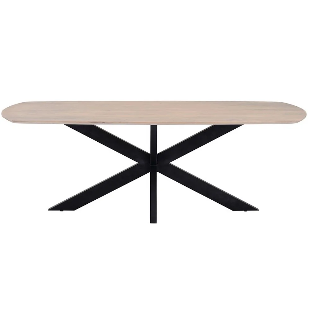 Table à manger avec plateau en manguier massif. Le plateau de la table a une épaisseur de 27 mm et est pourvu d’un rebord biseauté et une finition blanchie vernis