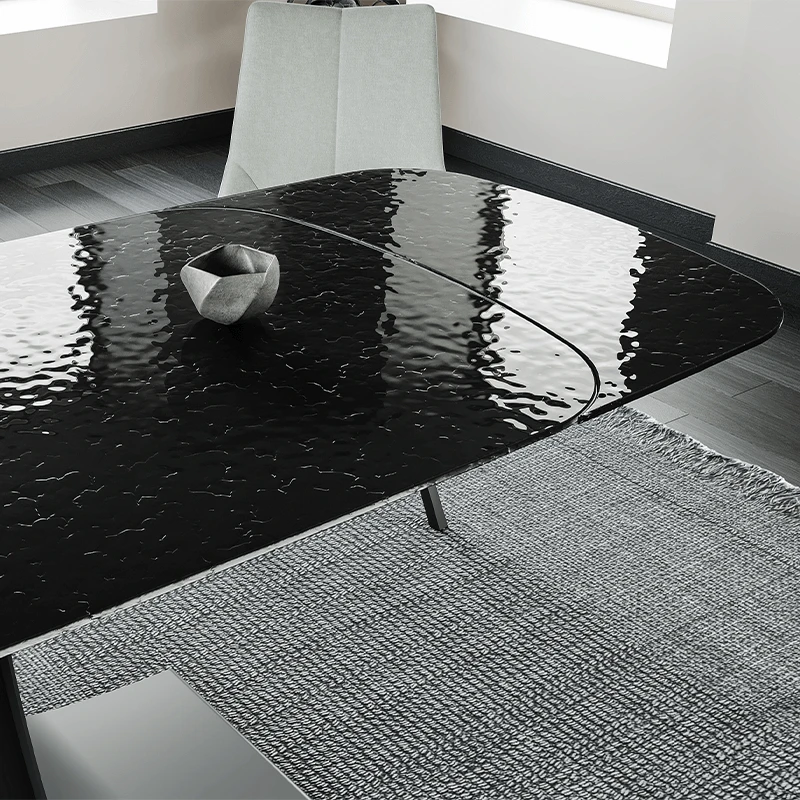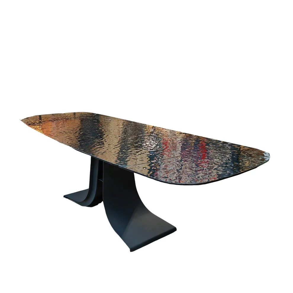La table Aurel avec plateau waterglass est un verre fondu (10 mm d’épaisseur) avec effet d’eau.