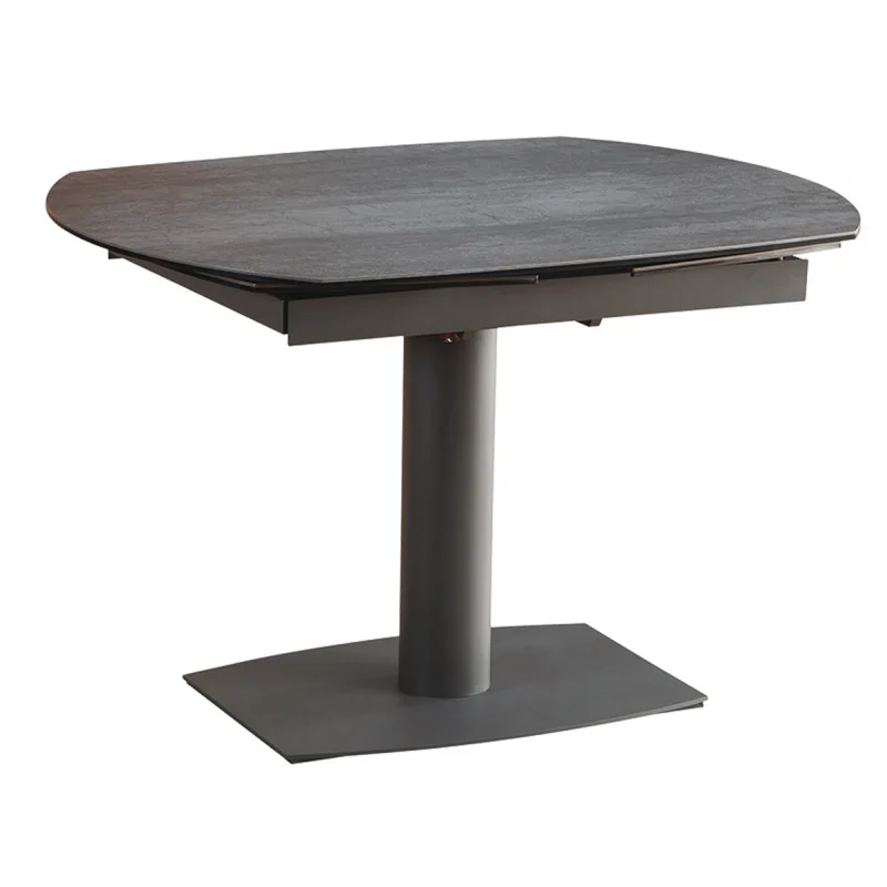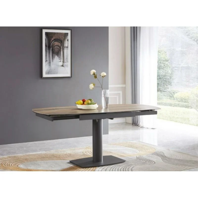 Cette table possède deux allonges sur chaque extrémités du longueur de 30 cm avec système de mise en place automatique des allonges qui sortent en faisant pivoté le plateau central.