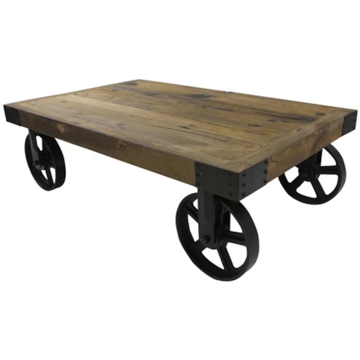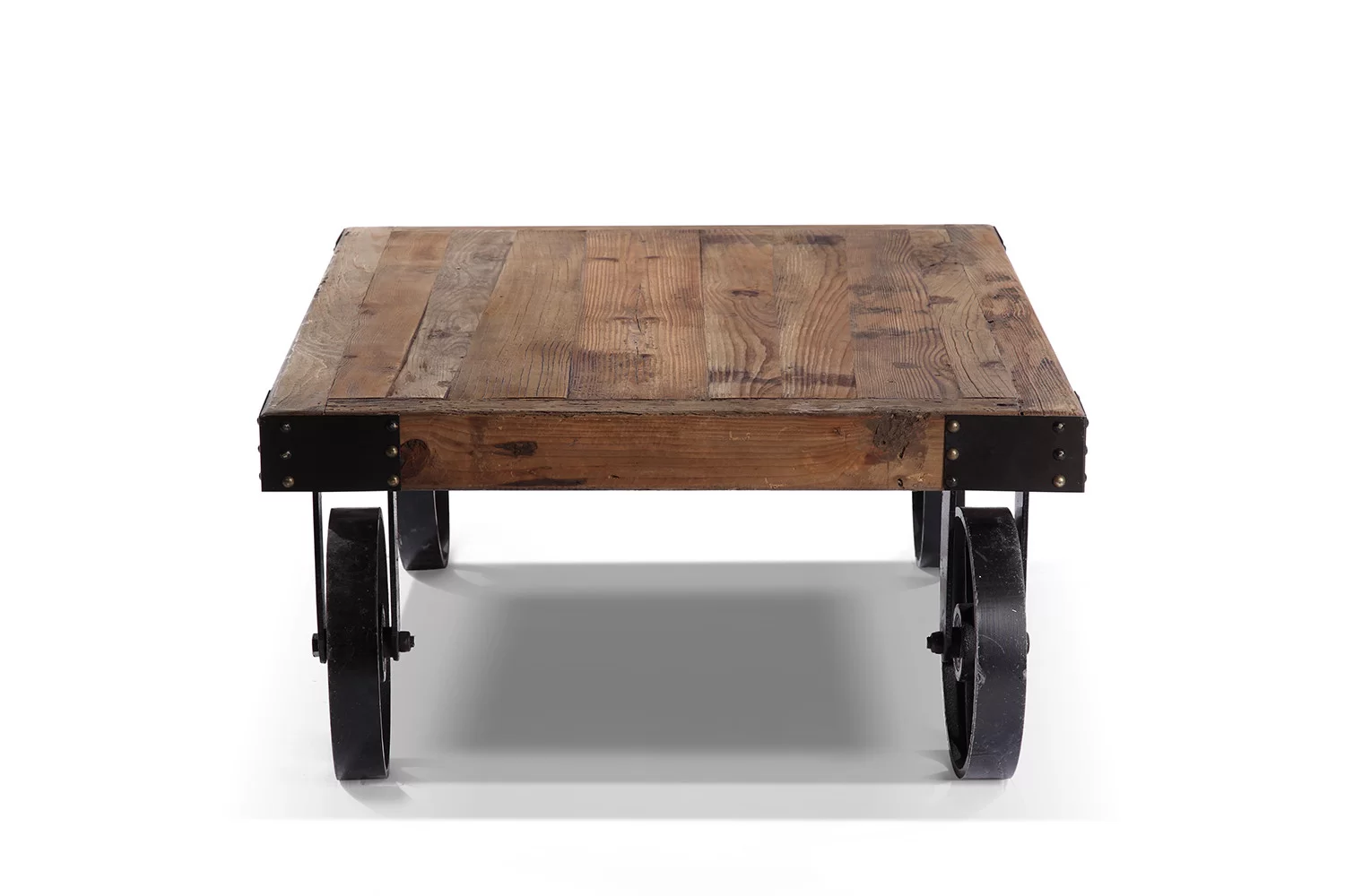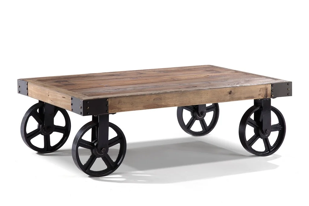 Avec son plateau en orme et pin effet vieilli monté sur des roues en fer, la table basse est robuste et mobile : ses roues lui permettent d’être déplacée facilement pour optimiser la décoration de l’intérieur.