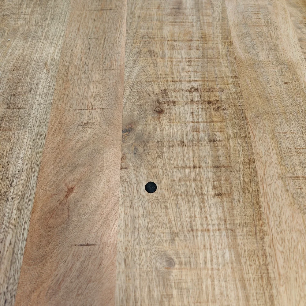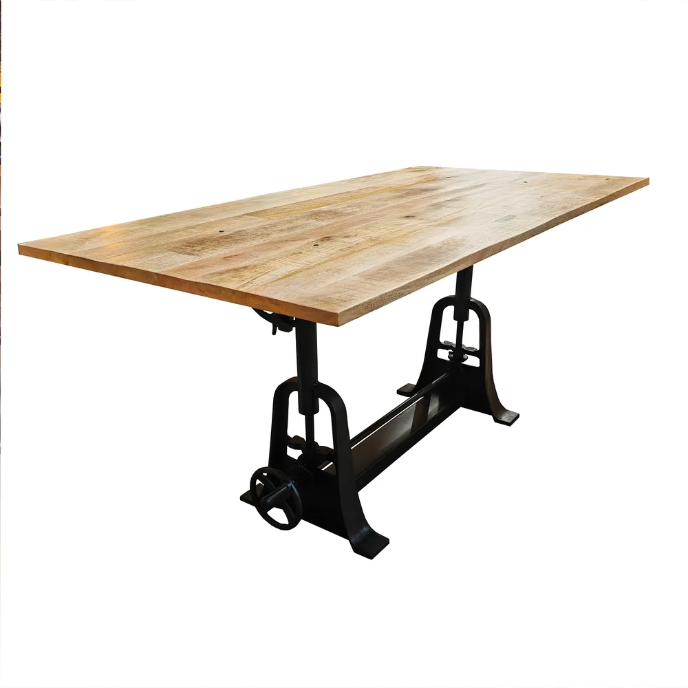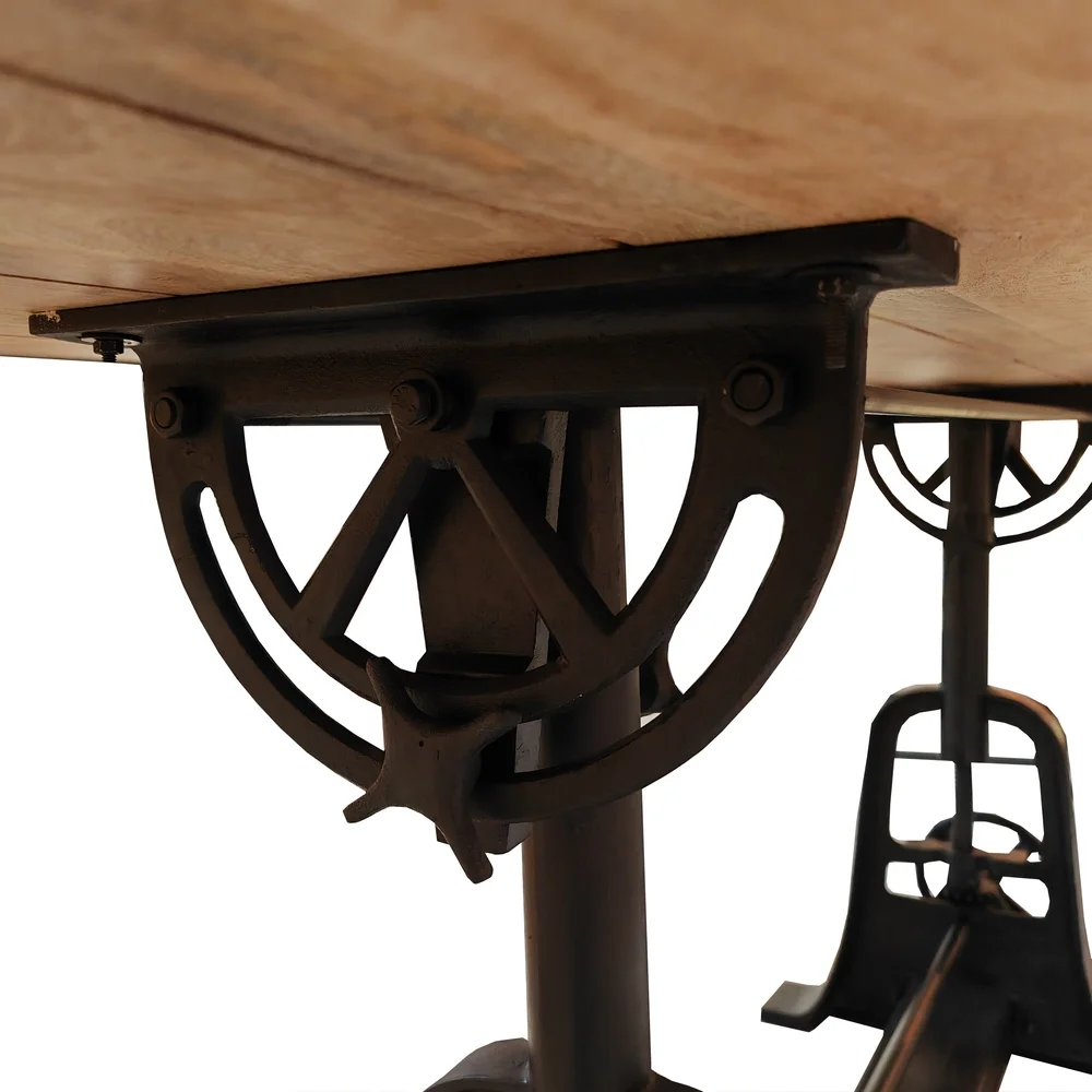 Belle table plateau en bois de manguier massif naturel vernis et son pied en fonte noir avec manivelle de réglage pour la hauteur allant de 77 cm à 103 cm, et la possibilité d’incliné le plateau avec un compas de réglage vers la droite ou vers la gauche. Elle donnera un esprit très industriel à votre pièce. Subtil mélange d’exotisme et de notes industrielles pour cette table repas.