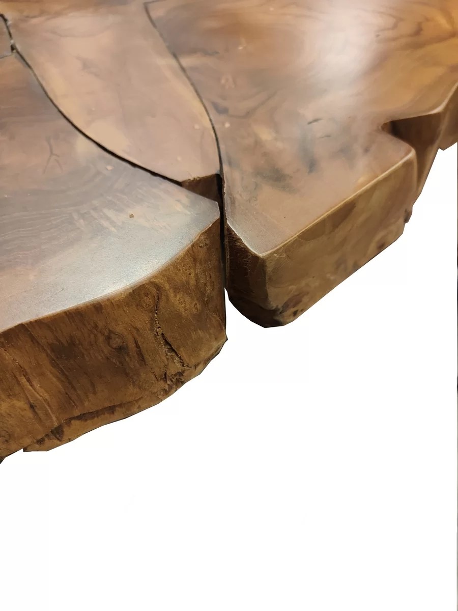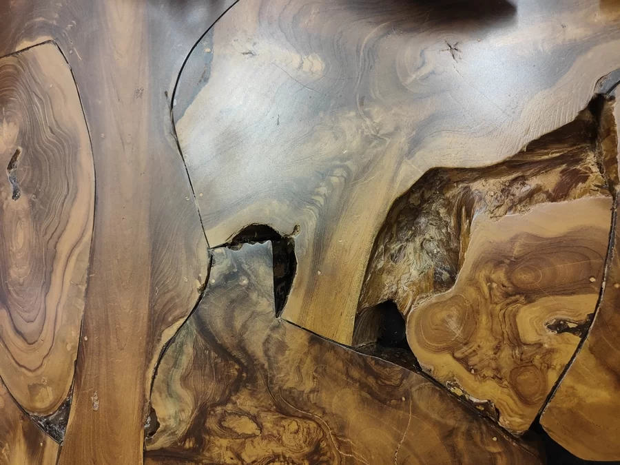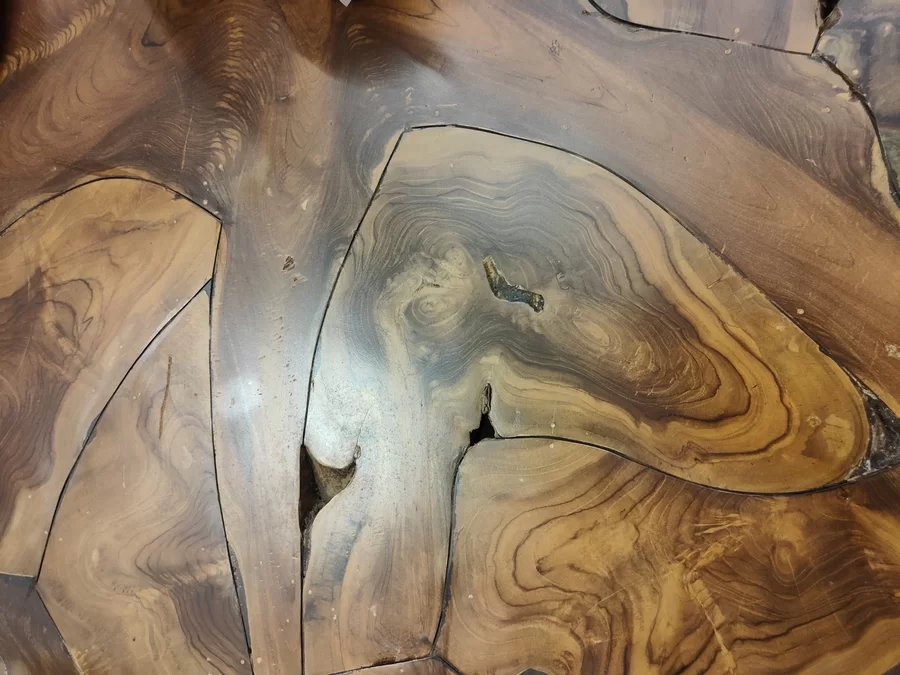 Table repas ronde de la collection Palaos avec un mix de métal noir pour le pied en forme d’étoile et de racine de teck sur le plateau en façon puzzle