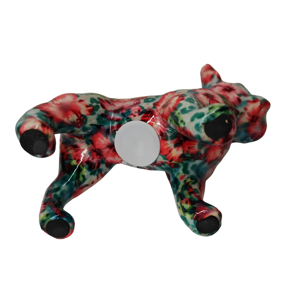 Tirelire Bulldog Français en céramique très coloré base verte avec des hibiscus de différentes couleurs. Une création de la marque Pomme Pidou.