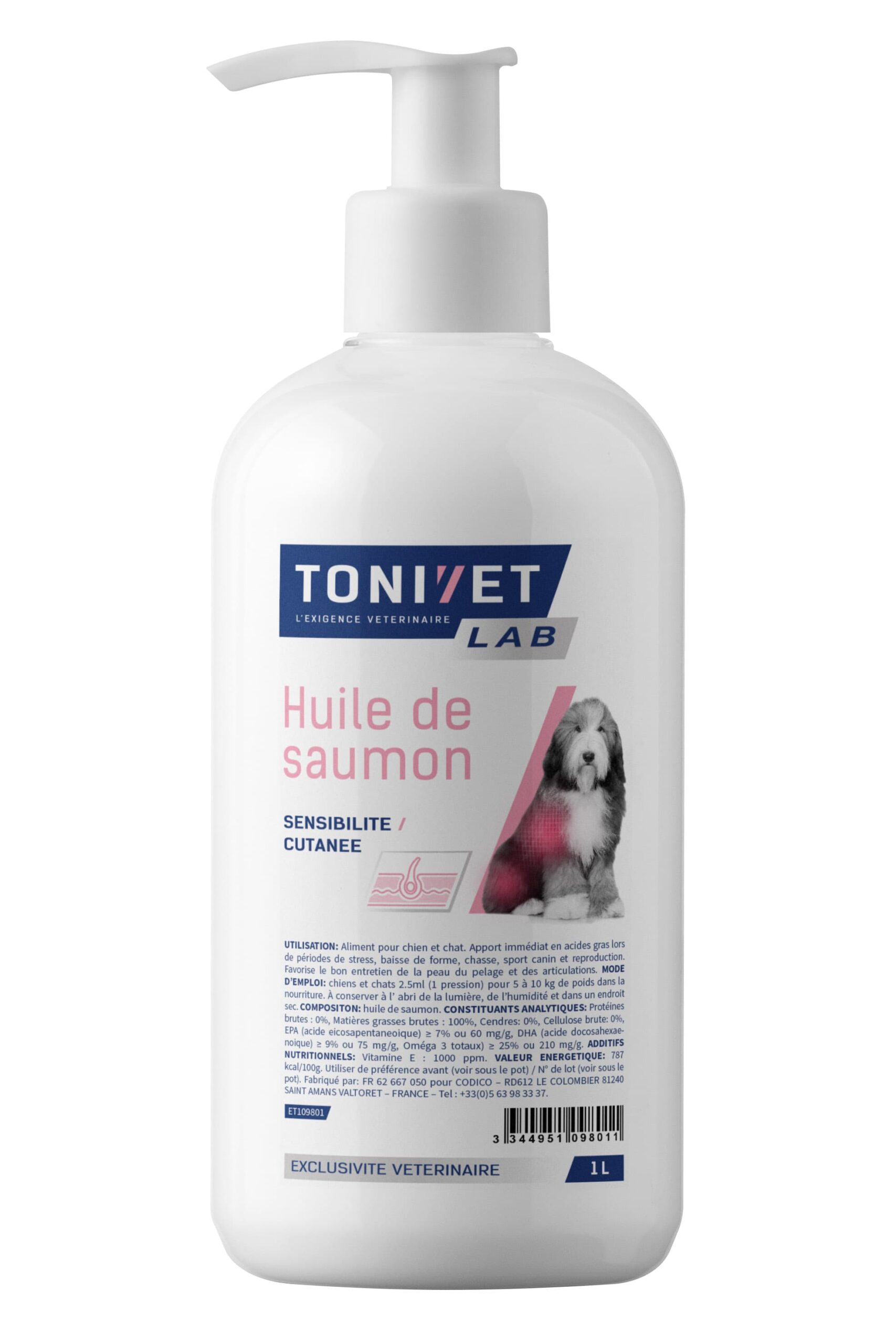 L’huile de Saumon pour chien et pour chat TONIVET est un complément nutritionnel qui permet un apport supplémentaire en acides gras pour redonner de la vitalité (chiens adultes). Son utilisation est particulièrement recommandée en cas de périodes de stress, baisse de forme, chasse, sport canin, reproduction, perte de poids et manque d’appétit. De plus, elle participe à l’entretien du poil, de la peau et des articulations. Avec sa pompe, le flacon est très facile d’utilisation.