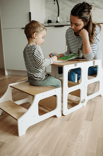 Conçue en tenant compte des principes pédagogiques de Maria Montessori mais aussi de la réalité des espaces dans lesquels nous vivons, la tour évolutive 3-en-1 est un incroyable outil pour impliquer nos enfants dans les tâches quotidiennes de la maison mais aussi pour servir de support à leurs activités de création, de concentration, de jeu.