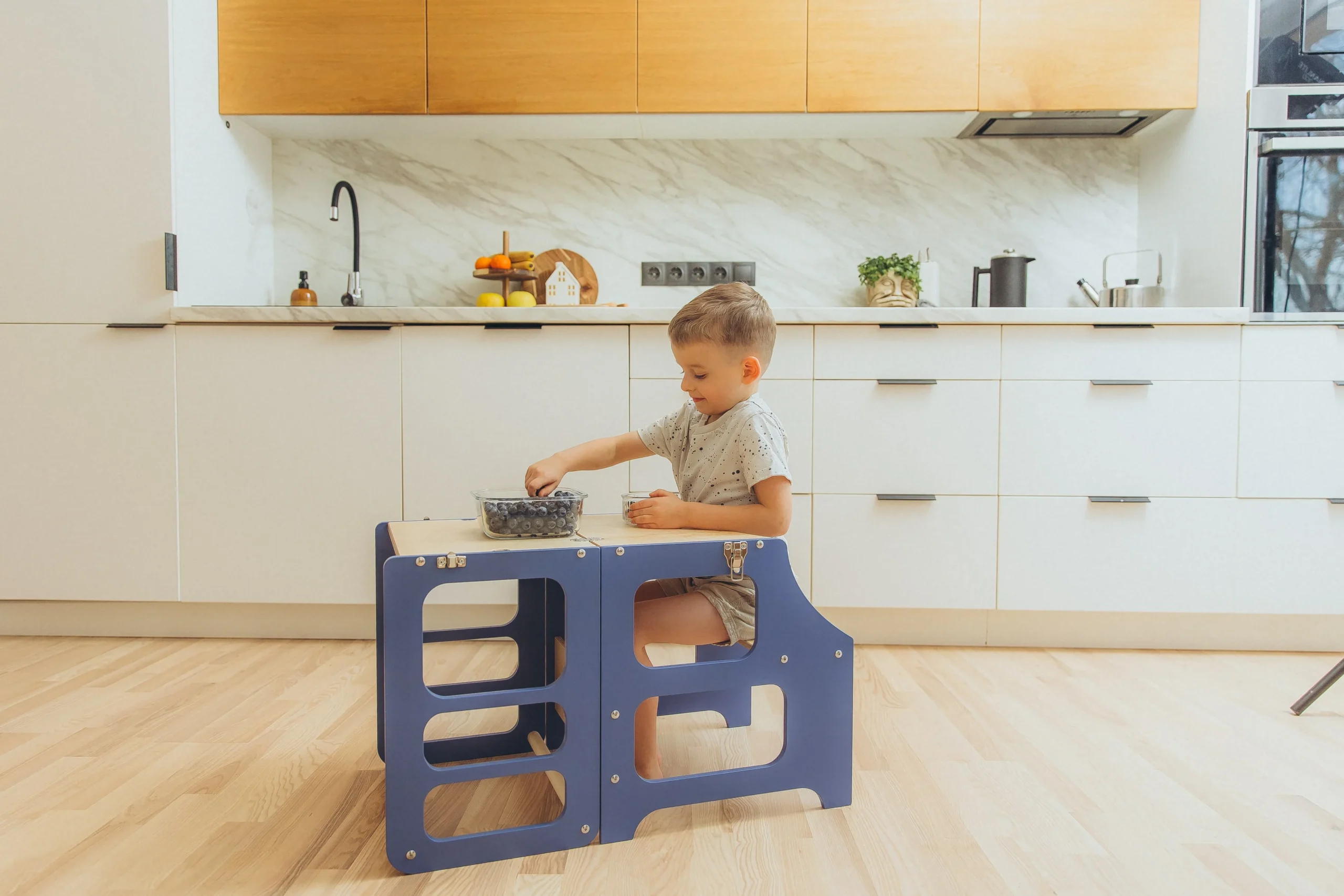 Sous forme de tour, l’enfant s’en servira pour observer, faire seul, ou partager des moments avec nous. Par exemple en cuisine, où les enfants apprennent tout en nous assistant. Ils disposent, rangent, nettoient, découpent, étalent, remuent… Ils découvrent aussi les textures, les sons, les odeurs et les goûts, ainsi que le plaisir de faire, ensemble.