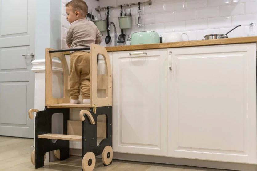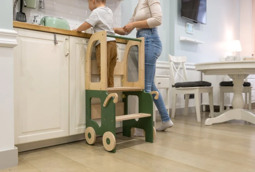 Sous forme de tour, l’enfant s’en servira pour observer, faire seul, ou partager des moments avec nous. Par exemple en cuisine, où les enfants apprennent tout en nous assistant. Ils disposent, rangent, nettoient, découpent, étalent, remuent… Ils découvrent aussi les textures, les sons, les odeurs et les goûts, ainsi que le plaisir de faire, ensemble.