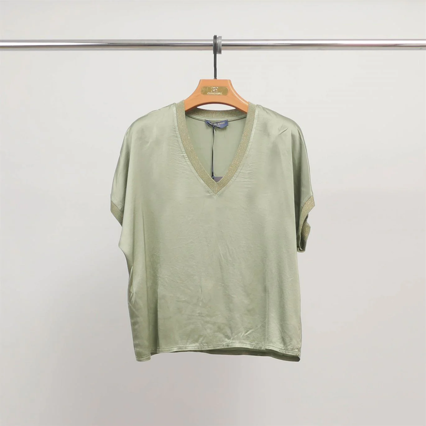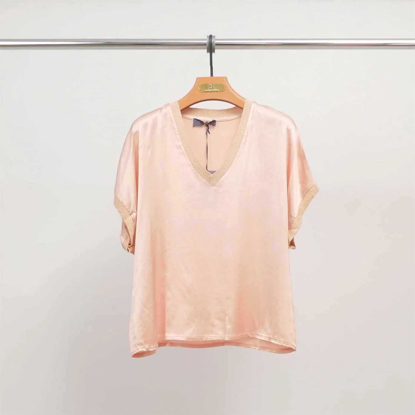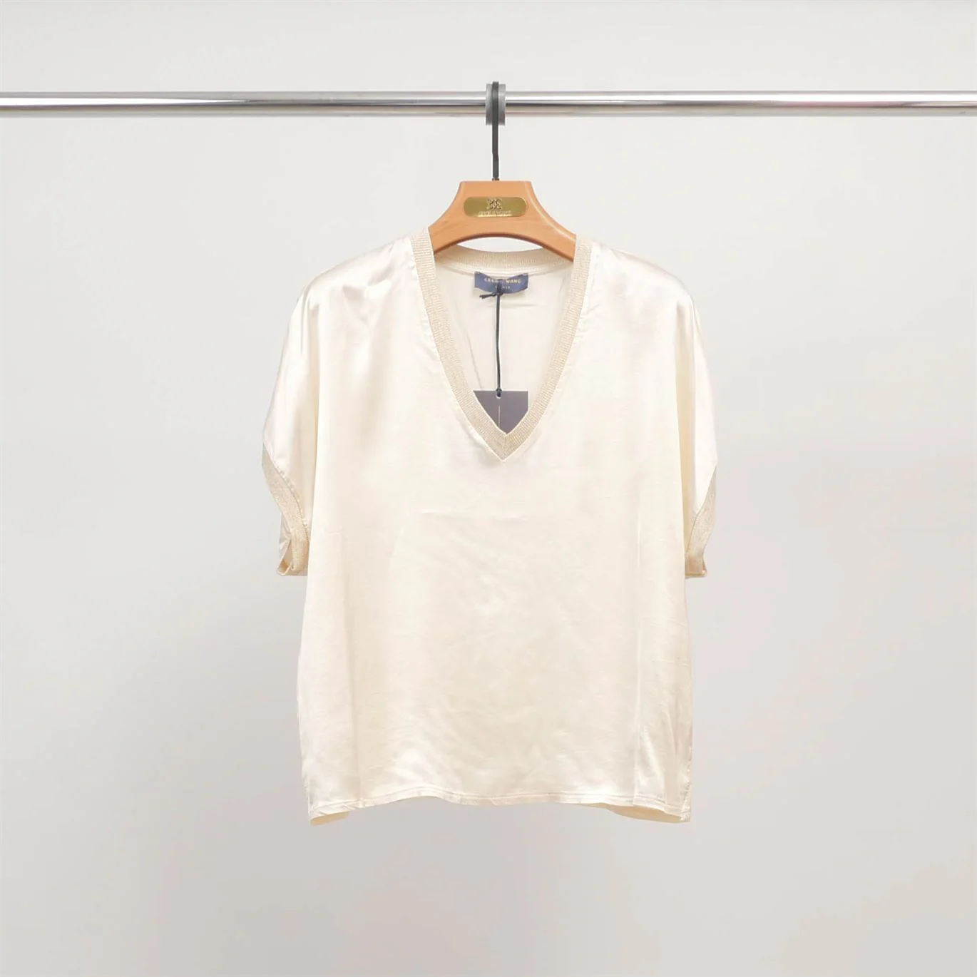 Ses manches courtes légèrement tombantes et sa coupe droite assurent un confort optimal, tandis que les bords en maille contrastante apportent une touche contemporaine. La matière associe douceur, brillance naturelle et élasticité pour un porté agréable en toutes circonstances.