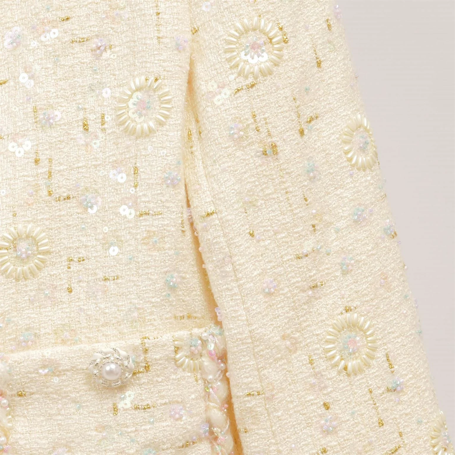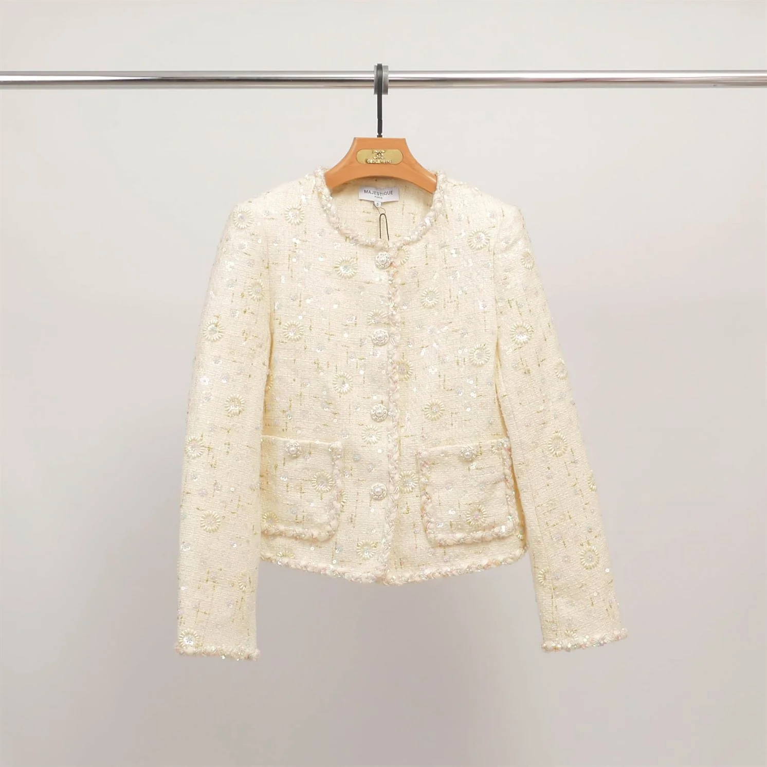 Un bijou de raffinement qui sublime toutes les silhouettes. Cette veste en tweed clair se distingue par ses broderies délicates et ses sequins scintillants, apportant lumière et élégance. Sa coupe droite et légèrement ajustée est rehaussée de poches plaquées et de boutons décoratifs effet perle, pour une allure chic et sophistiquée. Idéale sur une jupe assortie pour un look coordonné, ou portée avec un jean pour moderniser son esprit couture.