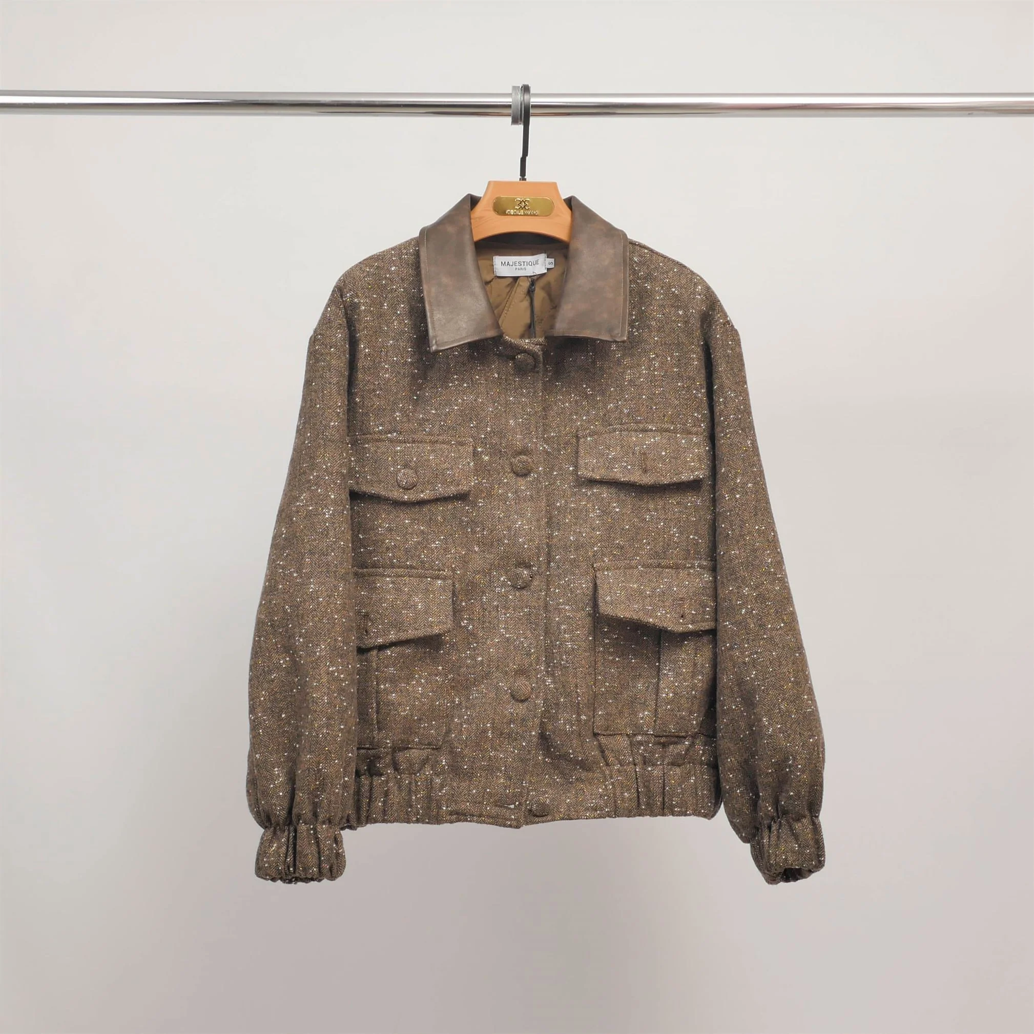 Une pièce forte au caractère affirmé pour structurer vos looks d’automne-hiver. Cette veste courte séduit par son allure vintage chic, avec son tissu tweed moucheté et son col contrastant effet cuir. Dotée de quatre poches à rabat et d’un élastique discret à la taille et aux poignets, elle allie fonctionnalité et style. Sa coupe ample et sa texture chaude en font une alliée parfaite pour affronter les journées fraîches avec élégance. Portez-la sur un pantalon assorti pour un ensemble coordonné ou sur un jean brut pour un look plus décontracté.
